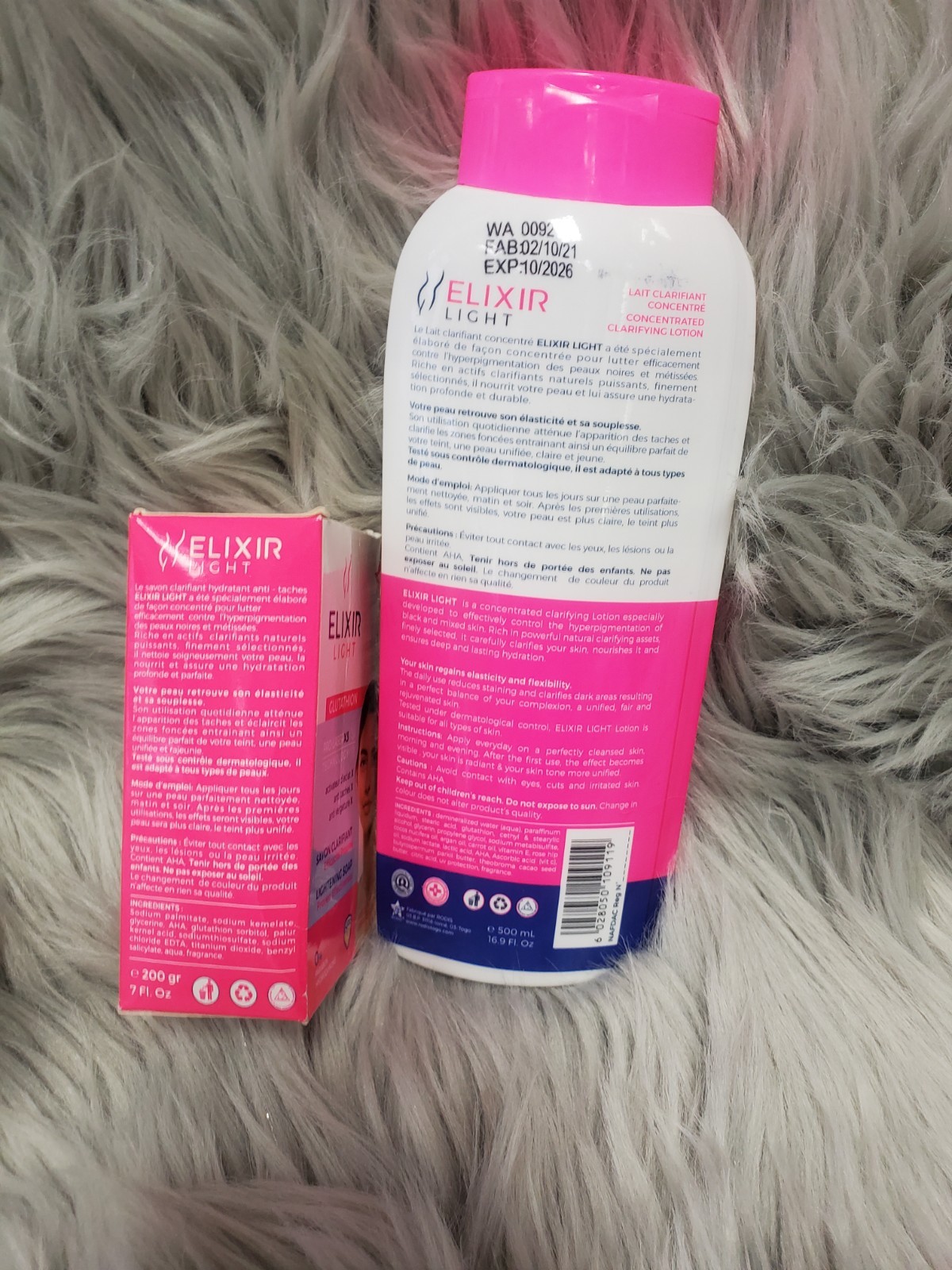 The Elixir Light Glutathione Clarifying Body Lotion 500ml and Soap SPF45 is a daily use skincare set designed to target acne scars, dark spots, and other skin discolorations. With a broad spectrum UVA protection and hydrating formula containing argan oil and glycerin, this product is suitable for all skin types. The set includes both morning and night treatments, featuring ingredients like stearic acid and vitamins to nourish and improve skin texture. Made in Côte d'Ivoire, this product boasts a floral scent and long expiry date, making it a reliable option for achieving a clearer and brighter complexion.
