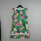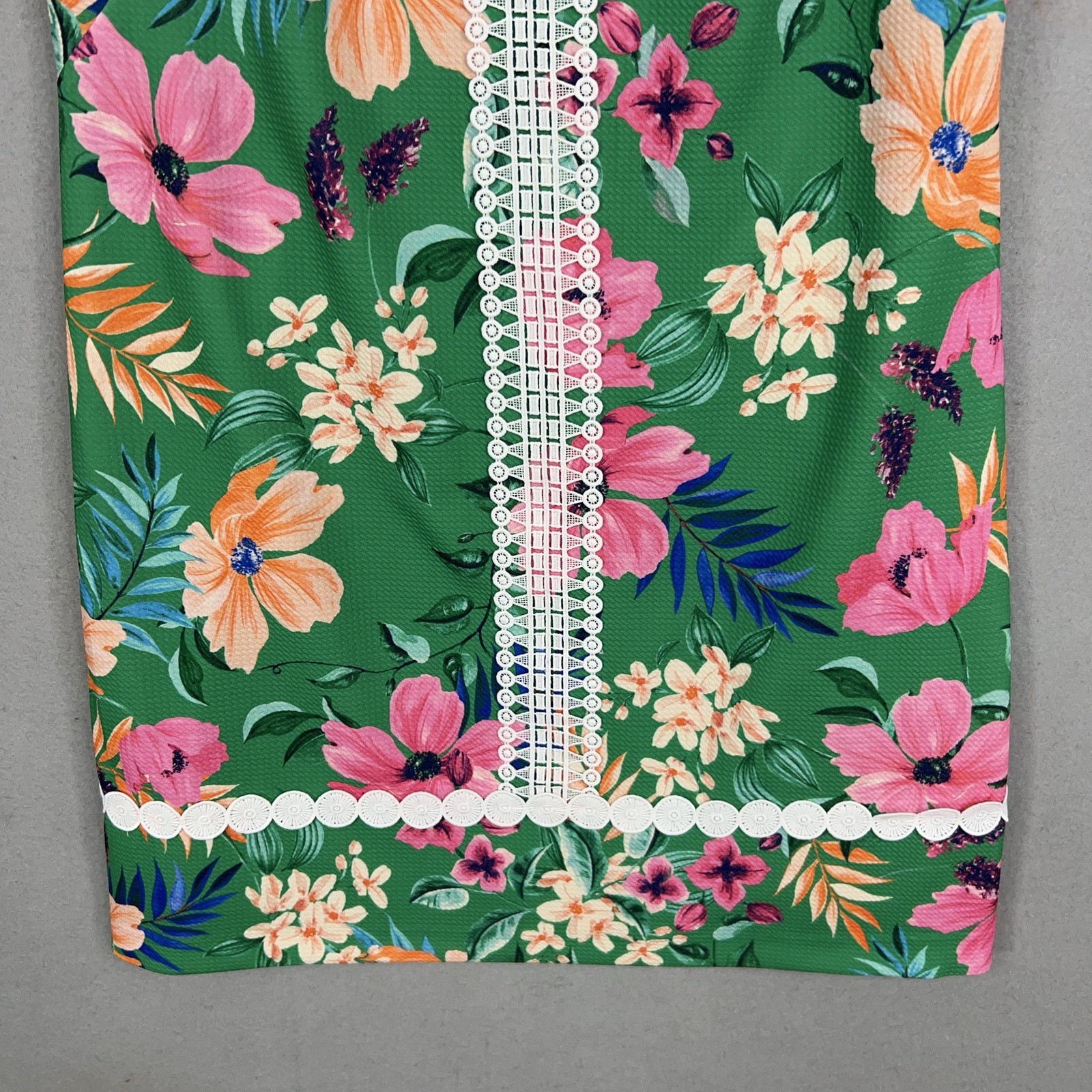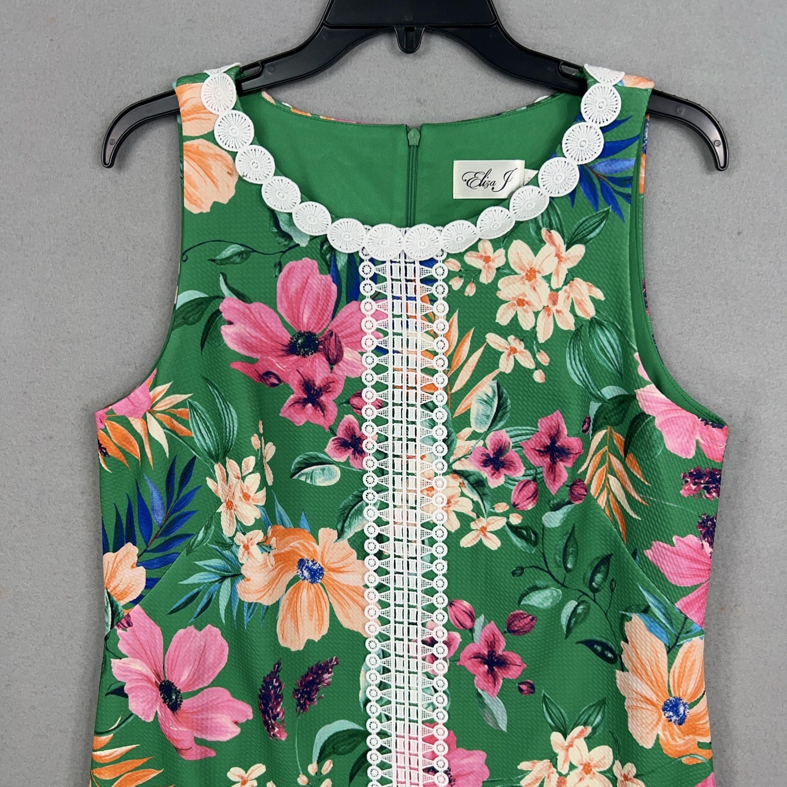 Eliza J Dress Womens 14 Green Floral Lace Feminine Romantic Spring Summer Office Condition: Gently worn, no visible flaws. All seams, trim, and fabric in very good condition. No stains, holes, or missing elements noted. Shell: 96% polyester, 4% elastane. Lining: 100% polyester. Bright green base with allover pink, orange, blue, and cream floral print. Features eyelet lace trim at neckline, down front, and near hem for a chic, retro-inspired look. Fully lined interior for comfort and structure. Concealed back zipper closure for easy wear. Brand: Eliza J (tag inside neckline) Size: 14 (Womens) Sleeveless sheath silhouette, perfect for spring and summer events, garden parties, weddings, or everyday style. Approximate flat measurements photographed for reference Measurements: - Previous washings may change the sizing written on the tag. - Please refer to the photos above for all measurements. - Please compare our measurements to that of one of your favorite garments. - Please note, item measurements are approximate . All items are bagged and sealed after being photographed, then stored in a smoke free environment to ensure the item is exactly the same as when photographed. All items have been washed per eBay standards & policies. I carefully package and ship daily. Feel free to contact me with any questions.