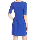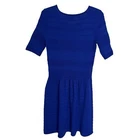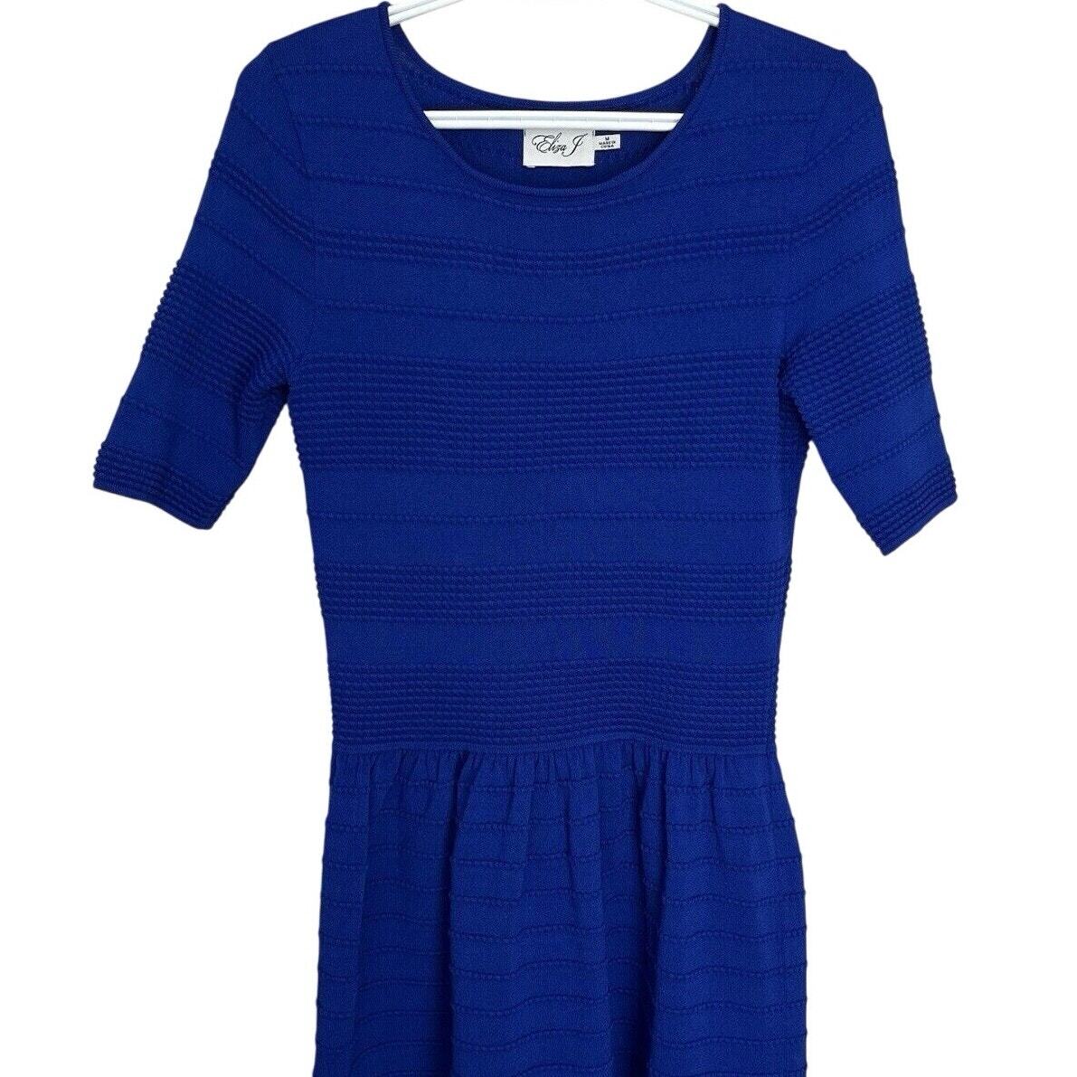 Eliza J's royal blue fit and flare sweater midi dress is perfect for any occasion, be it a party, work, or business. The dress has a knee-length hemline, half sleeves, and a round neckline. It is made of knit fabric with a textured finish and features a collarless design and stretchy material. The dress is available in medium size and has a colorful, classic theme that suits winter, fall, and spring seasons. In excellent condition. Measures approximately 17” across bust laying flat and 37” in length from shoulder to hem