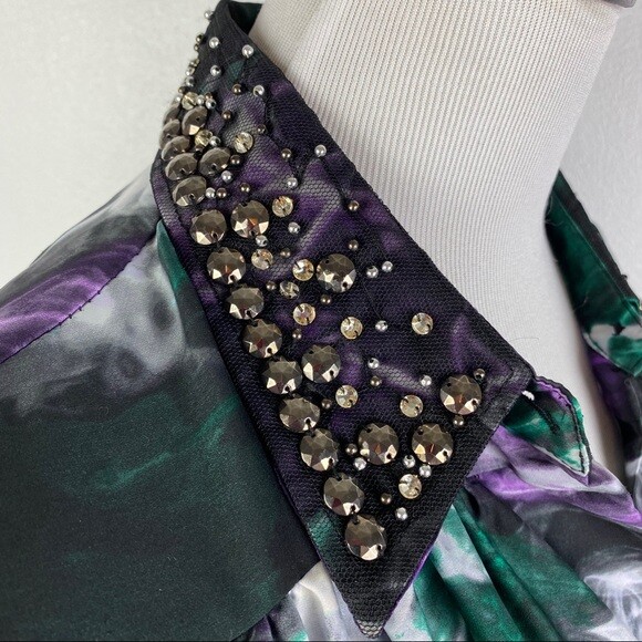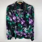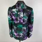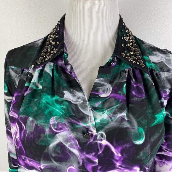 Ellen Tracy Women's X-Small Green Purple Abstract Print Long Sleeve Button Down Blouse. Embellished beaded studded collar with pleated detail on back. Chic long-sleeve button-down shirt crafted in polyester featuring abstract print throughout. Great condition. Smoke free home. 100% Polyester Size: XS Measurements are approximate Pit to Pit: 19" Length: 25" Sleeve: 24" #784