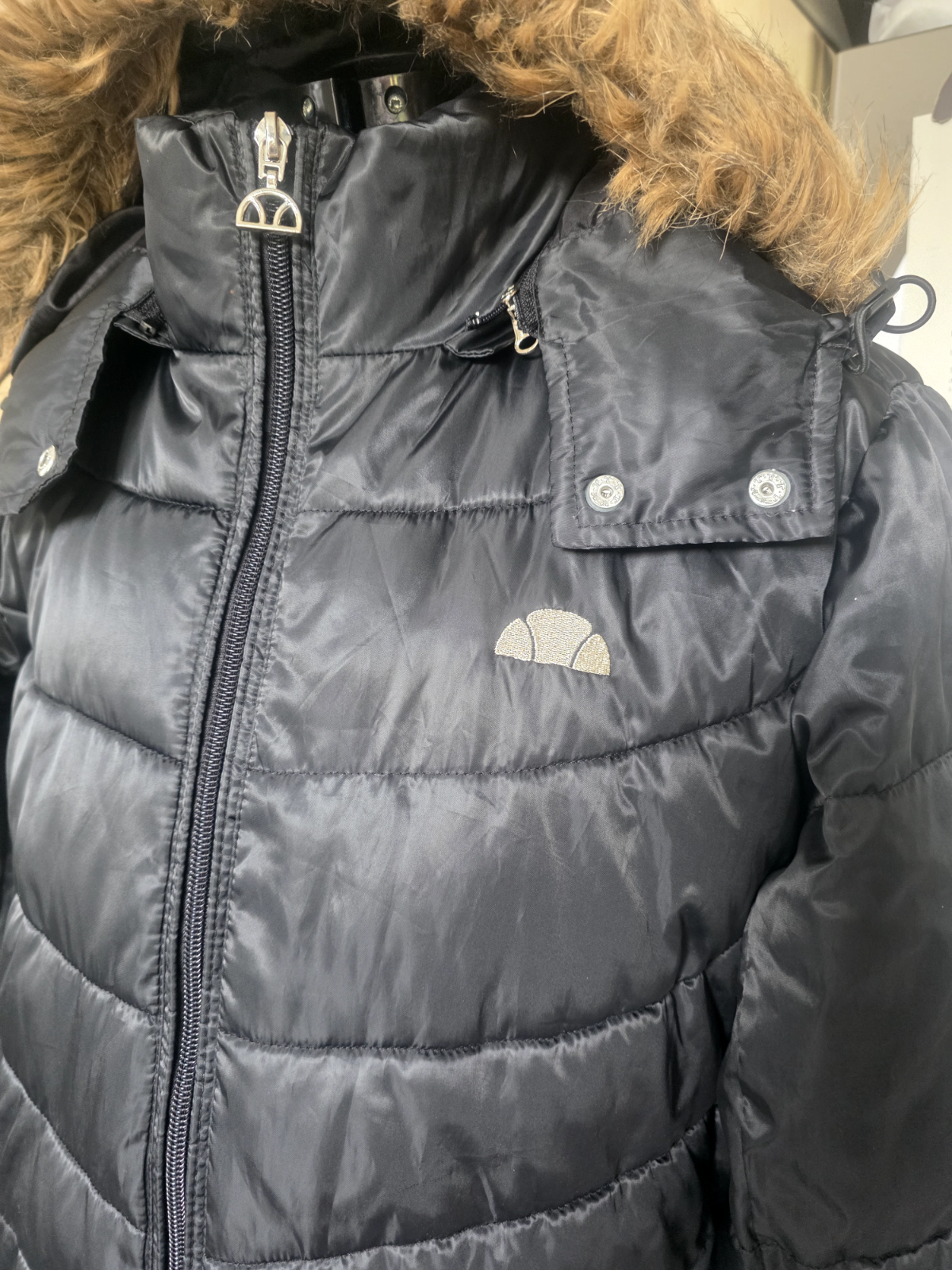 This coat combines comfort, functionality, and a touch of graphic flair to elevate your wardrobe. UK L PIT-PIT 20" LENGTH 28" Crafted with a sleek black outer shell, this coat exudes a timeless and versatile look that effortlessly pairs with any outfit. The long sleeves provide extra coverage and warmth, while the zip-up front allows for easy on and off. Featuring a graphic design on the front, this coat adds a unique and eye-catching element to your ensemble. The hood offers added protection against the elements, shielding you from wind and rain while adding a sporty touch to your overall look. Made with high-quality materials, this coat is designed to keep you cozy and comfortable throughout the colder seasons. The long length provides extra insulation, keeping you warm even in chilly conditions. The adjustable drawstring at the waist allows you to customize the fit and accentuate your figure. With its practical design, this coat offers ample storage space with two side pockets, perfect for keeping your essentials close at hand. Whether you're heading out for a casual outing or braving the winter weather, this hooded coat provides both style and functionality.