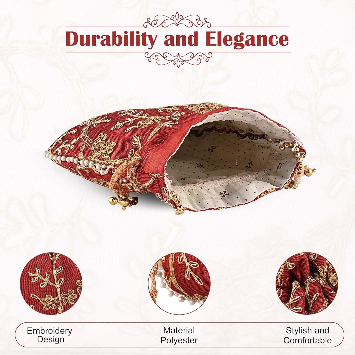 Sameer Enterprises❤️ PACKAGE CONTAIN : 1 Piece Traditional Indian Potli Bags | MATERIAL : Silk| PACKAGE DIMENSION : 22 cm x 17 cm x 12 cm 💙 UNIQUE ARTISANAL FLAIR : Indulge in the allure of unique artisanal flair with our collection of traditional potli bags. Each bag is a masterpiece, meticulously handcrafted by skilled artisans who infuse their expertise and passion into every intricate detail. As you hold one of our potli bags, you're not just carrying an accessory; you're carrying the culmination of centuries-old techniques and artistic traditions. 🧡 CULTURAL CONNECTION & FUNCTIONAL CHARM : Experience the profound cultural connection and functional charm that our traditional potli bags bring to your world. These bags aren't just accessories; they're carriers of tradition, embodying the essence of centuries-old craftsmanship. Whether you're attending a wedding, a festival, or simply want to infuse your day with a touch of tradition, our potli bags let you carry a piece of culture while embracing that defines your lifestyle. 💚 LEGACY OF ELEGANCE & CONSCIOUS FASHION : Embrace a legacy of elegance while making a conscious fashion choice with our exquisite traditional potli bags. These bags are more than just fashion accessories; they're a testament to the enduring charm of timeless designs.Our bags are a celebration of authenticity, free from the mass-produced trends of fast fashion. Step into the world of conscious elegance with our traditional potli bags. 💛 TRADITIONAL POTLI WITH DRAWSTRING : Creating a versatile accessory that captures the essence of tradition while catering to your contemporary lifestyle.The drawstring closure adds a touch of functionality, ensuring your belongings are secure while offering easy access to your essentials. Whether you're attending cultural celebrations, weddings, or simply want to infuse your everyday look with a hint of tradition, our potli bags with drawstring provide an elegant solution.