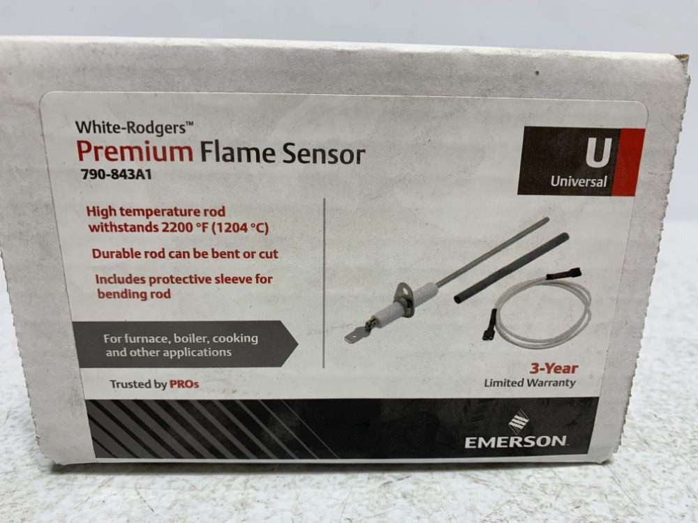 PRODUCT DESCRIPTION Emerson 790-843A1 Flame Sensor 2200 degF Universal This is a New Emerson 790-843A1 Flame Sensor 2200 degF Universal. It is designed for reliable performance in various heating applications. Product Details: - Brand: Emerson - Manufacturer Part #: 790-843A1 - Condition: Brand new, unused, and in original packaging. - High temperature rod withstands up to 2200°F (1204.44°C). - Can be bent or cut to replace over 120 part numbers. Shipping: Will ship USPS Ground Advantage - Free Shipping. Expedited shipping options available at checkout. Find one of our products cheaper elsewhere? We will beat the price. Feel free to make an offer. © Copyright Chase Surplus, Inc. All rights reserved.