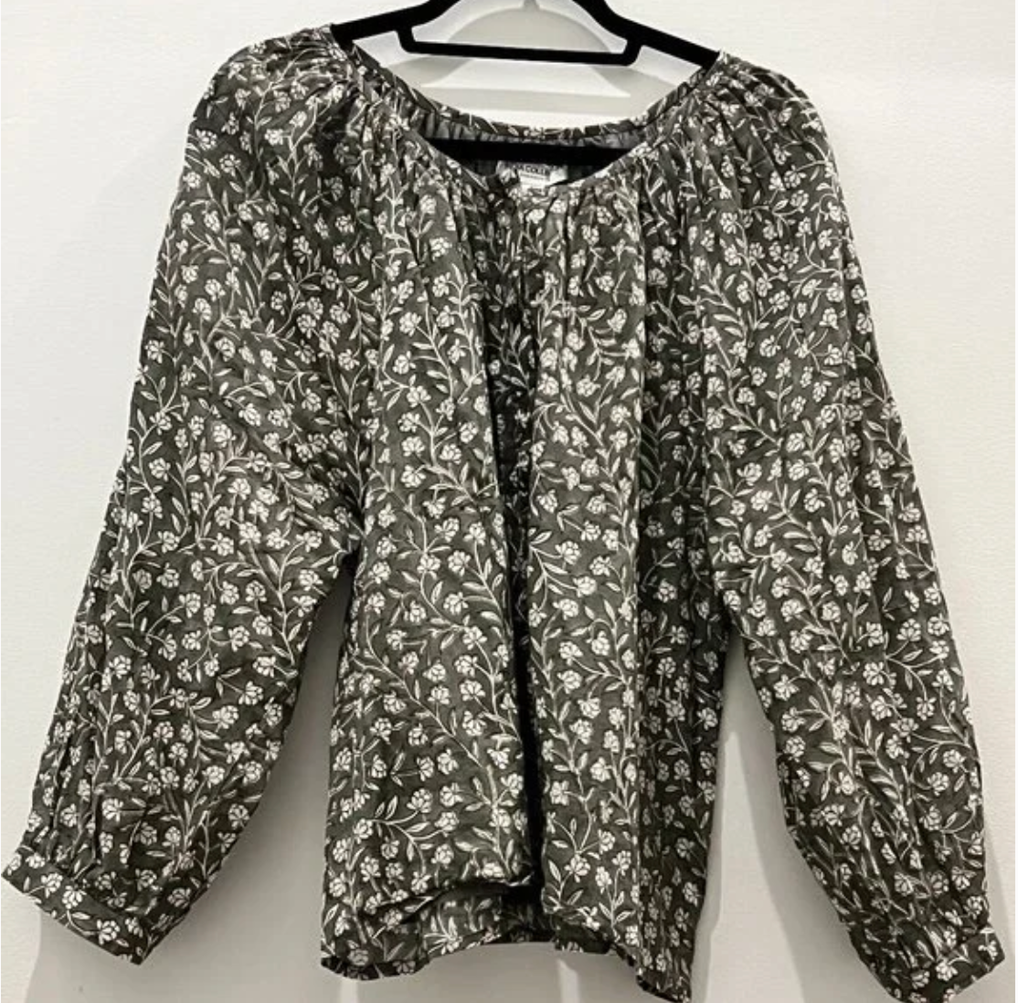EXCELLENT CONDITION: Emerson Fry Frances Blouse in Garden Hushed Green, part of the India Collection.- 100% Organic Cotton- Hand-block printed using low impact dye- Shirred, bound scoop neckline- Button front- Blouson style, full sleeves with button cuff- Straight hem- Lined- Easy, breezy fit- Model is a size XS/S and wearing a size Small for a- more oversized/relaxed fit- Hand wash cool, gentle + line dry- Made in Rajastan, IndiaCOUNTRY OF MANUFACTUREIndiaFIT TIPFits true to size.FABRIC / MATERIAL100% Organic Cotton