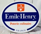 This is an extremely rare Emile Henry lighted plastic store display sign, measuring 12x9.5 inches. The sign features the brand's name in white letters and is an advertising piece for their merchandise and memorabilia. It is a collectible item and would make a great addition to any advertising or store display collection.