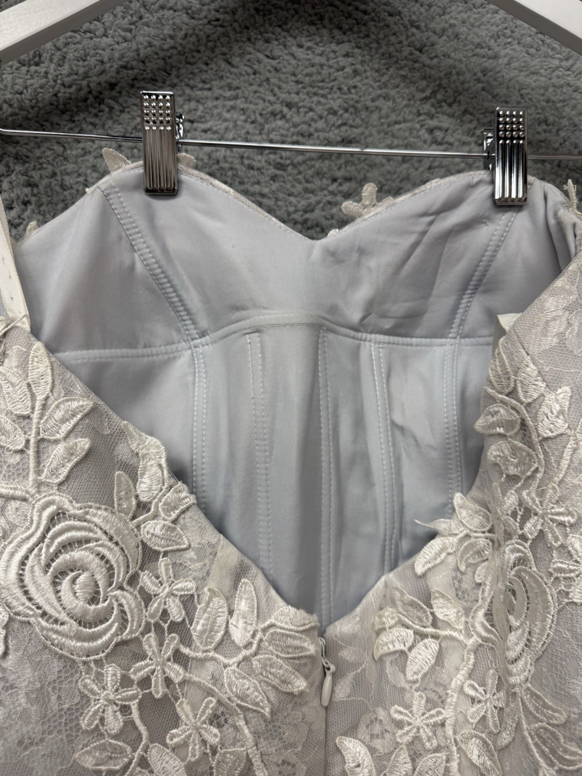 Elevate your wardrobe with the Emily Hart Light Grey A-Line Dress, a versatile piece that exudes sophistication. Designed for a regular fit, this women's size 8 dress features a flattering sweetheart neckline and a seamless zip closure at the back, ensuring a seamless silhouette. Its charming floral pattern adds a touch of springtime flair, while the long dress length offers a graceful drape suitable for various formal occasions. Crafted from a polyester blend with a mesh fabric type, this dress promises both comfort and durability. The dress is lined to ensure a smooth fit and is easily maintained with dry clean only instructions. Whether you're attending a cocktail party, a wedding, or a formal event, this sleeveless garment, adorned with an 80s-inspired floral theme, is a stylish choice for fall, spring, or summer seasons. Measurements- Bust-16 inches Waist-15 inches Length-85 inches Shoulder to Shoulder-18 inches From Local Wedding Retailer