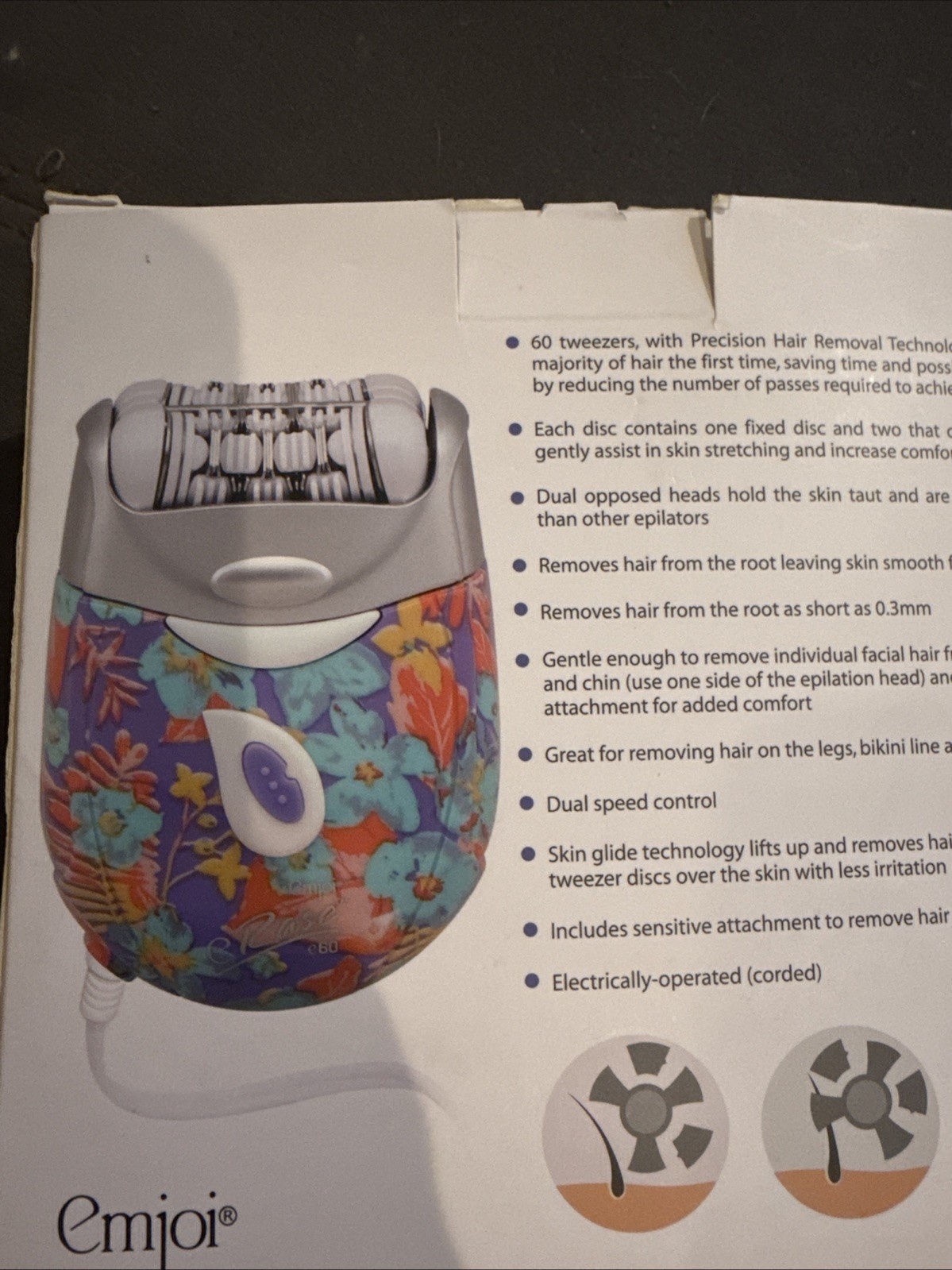 Emjoi Erase Hair Remover Double Head Trimmer Epilator Floral Corded NEW IN BOX never used. Still original packaging.