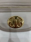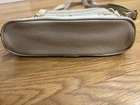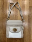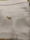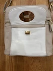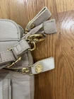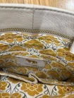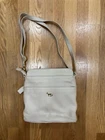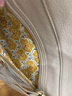 Emma Fox beige and off white leather shoulder bag measuring approximately 10” by 10”. It has an adjustable shoulder strap and zipper closure. On the exterior there is a zippered pocket and a pocket secured by a buckle. The lining is a cotton floral print. The interior has three pocket sections without closure. All hardware is gold tone. The bag is in very good condition. See photos for any marks. Preowned.