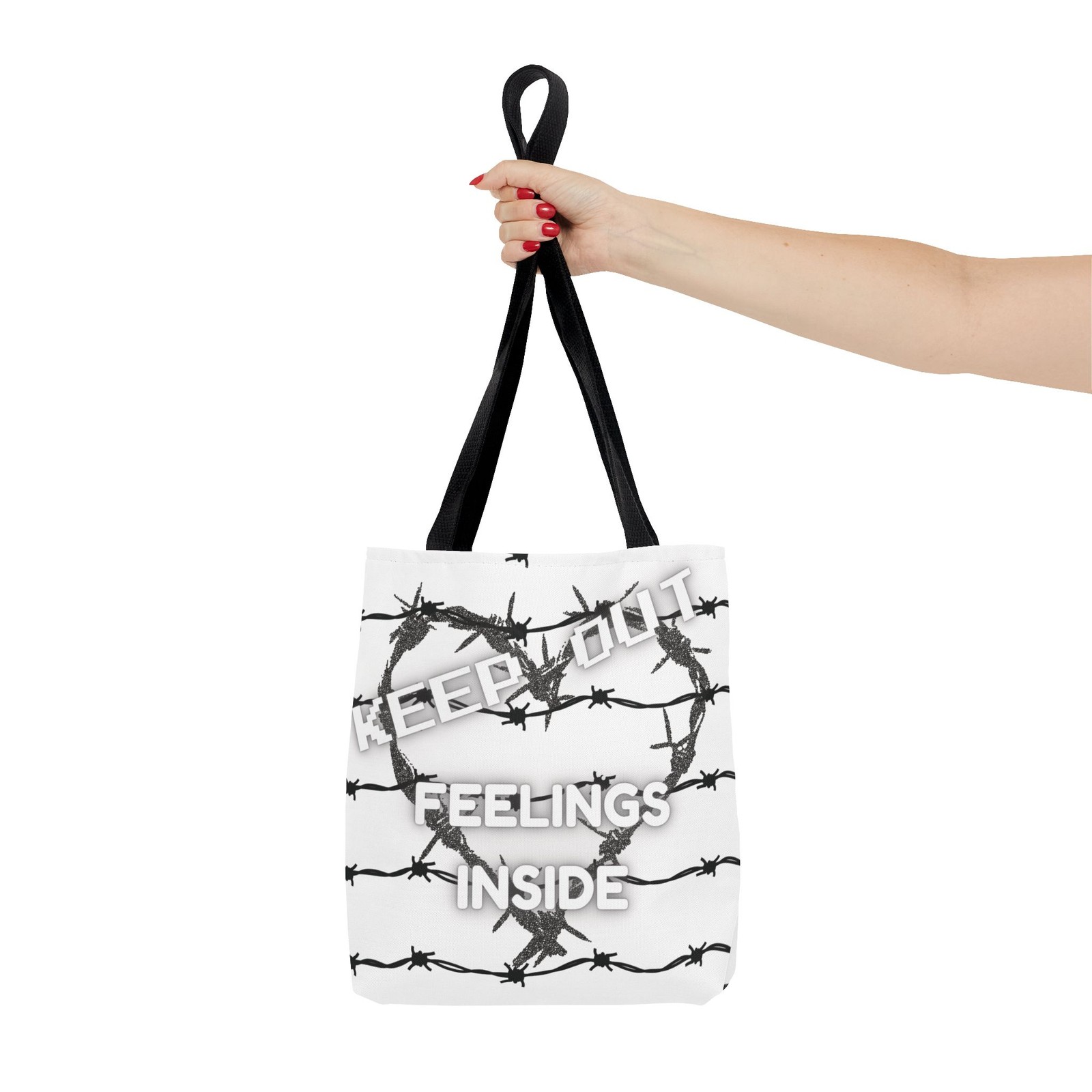 Protect your emotional baggage in style with our “Keep Out – Feelings Inside” tote bag — the perfect blend of sarcasm, softness, and stay-away energy. Featuring a bold barbed wire heart design on a durable canvas tote, this bag says what you’re thinking so you don’t have to. Whether you’re hauling books, snacks, or your latest emotional crisis, this is the ultimate carry-all for those who feel deeply... and want to be left alone about it.