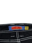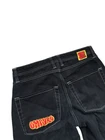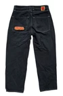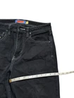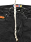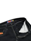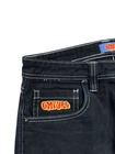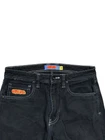 These Empyre jeans are in size 28 with a relaxed fit and straight leg design. They are made of denim fabric in a dark wash color with a black hue. The jeans feature a 5-pocket design, embroidered logo accents, and a mid-rise style. Perfect for urban, skate, or 90s themed streetwear, these Y2K-inspired jeans are suitable for all seasons and easy to care for with machine washable material.