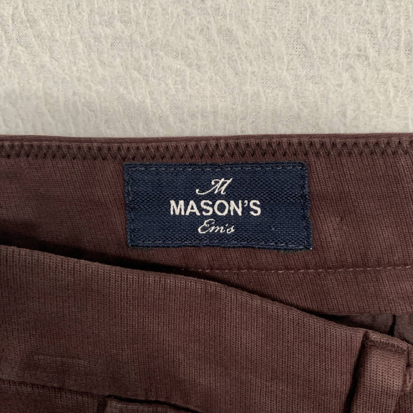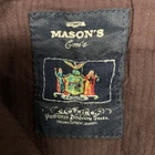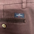 These Em's of Mason's New York Men's Size W36/L32 52 Chino Pants in a burgundy maroon are versatile for various occasions including travel, casual, formal, workwear, and business. Made from a soft cotton blend with stretch, these pants feature a classic fit with a straight leg style and flat front. They have a zip and button closure, slash pockets, and are machine washable. Perfect for year-round wear, these pants are accented with buttons, zippers, and the brand's logo, adding a touch of sophistication to any outfit.