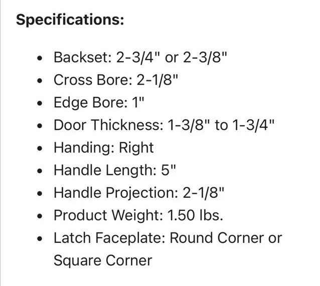 Message me for backset size you need 2 3/8 or 2 2/4 And latch option available for Round or square Constructed from solid brass for a heavy duty feel and lasting durability Includes all necessary hardware for easy installation Covered by Emtek's limited lifetime manufacturer warranty Thick Door Kit required for doors over 1-3/4" door thickness, see KT4-EXTPRIV Backset: 2-3/4" or 2-3/8" Cross Bore: 2-1/8" Edge Bore: 1" Door Thickness: 1-3/8" to 1-3/4" Handing: Right Handle Length: 5" Handle Projection: 2-1/8" Product Weight: 1.50 lbs. Latch Faceplate: Round Corner or Square Corner