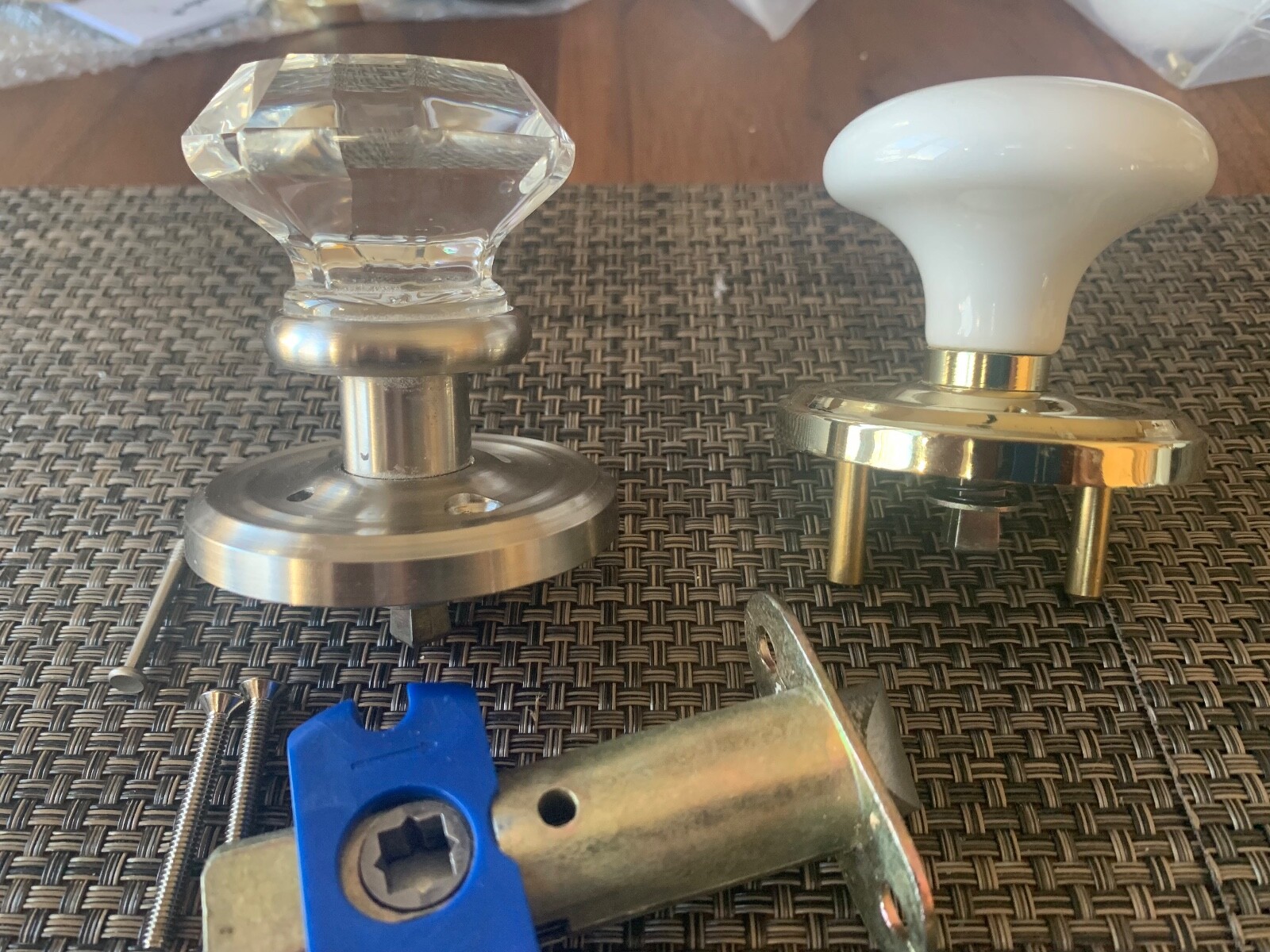 Emtek privacy door knob set. The interior knob with locking pin is an Old Town Privacy Door Knob with Regular Rose in Brushed Nickel from the Crystal Door Hardware Collection. The exterior knob is the Privacy Ice White Knob And Regular Rosette in Polished Brassfrom the Porcelain Door Hardware Collection. The strike plate is brushed nickel. The set is used but in perfect working order.