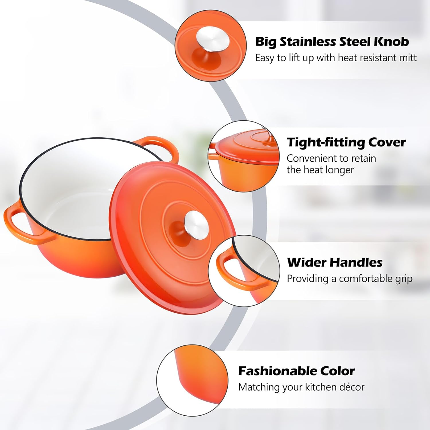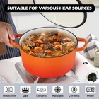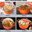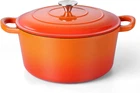 NONTOXIC & LONG LASTING - TeamFar 6qt dutch oven constructed of thick cast iron core with 2 layers enamel coatings, No harmful chemicals or metals leaching to ensure non-toxic and healthy cooking process, Heavy gauge construction and you will feel solid in hands and great rust resistance help it last for a longer term GOOD HEAT CONDUCTION & RETENTION - The cast iron dutch oven pot distributes the heat evenly from bottom to sidewalls to reduce overcook or undercook, The self-basting cover seals on the stew pot to lock the moisture for getting juicer and tender results, Retaining the heat well to keep your food warmer longer, Let you and your family enjoy the wonderful meals EASY TO USE & CLEAN - No seasoning needed and easy to cook your favorite meals on induction, gas, ceramic, glass, halogen and other stovetops, Plus, oven safe up to 500℉ to offer a wider range of cooking options, Porcelain nonstick surface effectively minimizes food sticking to make cleanup a breeze, Hand-wash with warmer and soapy water recommended ERGONOMICAL DESIGN & STYLISH COLOR - Dual handles and cooking pot body are one-piece construction and no worry about breaking off during taking it from stovetop to table, Wider, sturdy handles and a big stainless steel knob on the lid for easy lifting even with oven mitts, The vibrant color adds beauty to the kitchen to provide visual enjoyment and complement to other décors 6QT CAPACITY & VERSATILE - 6QT soup pot can serve 4-6 peoples and is suitable for daily or a small party gathering, Can meet various kitchen tasks, like Making Homemade Chicken, Cooking Vegetable Soup, Baking Sourdough, Braising Meat and more, A go-to stock pot in your daily life and a great choice for your families or friends on festivals TeamFar 6QT Dutch Oven Pot with Lid composed of cast iron core and 2 layers of enameled coatings. No worry about harmful substance leaching into food and ensuring healthy cooking. The ducth oven pot has good heat distribution to cook evenly to get nicely cooked results. The lid covered on better for locking the vapor to make food softener and keeping the original flavors. Nonstick enamel for easy food releasing and easy to hand wash. A greatly essential cooking pot to your kitchen. SPECIFICATION Capacity: 6QT Material: 3 ply – White enameled inner & cast iron core & orange enameled outer, stainless steel knob Dimension: Pot body Diameter – 10.6’’ (Top), 9.5’’ (Bottom) Height – 5.1’’ Lid Diameter – 10.75’’ Height – 1.75’’ Package Included: 1 Pot + 1 Lid + 1 User Manual Suitable Heat Sources: Induction, glass, gas, ceramic, electric, halogen, oven ADVANTAGES Healthy Cooking Made of food grade enameled coatings and premium cast iron. No toxic substance leaching and healthy for daily cooking. Enameled Coatings Non-stick inner surface minimizes sticking for easier cleanup. Modern and stylish outer surface greatly matches all kitchen styles. Cook Food Well This braising pot distributes the heat evenly from base to sidewalls to get nicely cooked results. Heavy Duty This cast iron dutch oven built with heavy duty construction and you will feel solid when holding. Long lasting for uses. Wide Uses Satisfying your cooking needs from slow stewing and boiling to roasting, baking. USING INSTRUCTION 1. Please wash with warm soapy water before first use. Citrus-based detergents are not recommended to avoid dulling the surface. 2. Please let the pot cool down after using and suggested to HAND wash with soft dishcloth to avoid damaging the surface. NOT DISHWASHER SAFE. 3. Please hand dry immediately after every washing, store in dry place. 4. It is not recommended to directly roast on the grill or outdoor campfires. 5. Wood or silicone cooking utensils recommended to keep the surface from scratches.