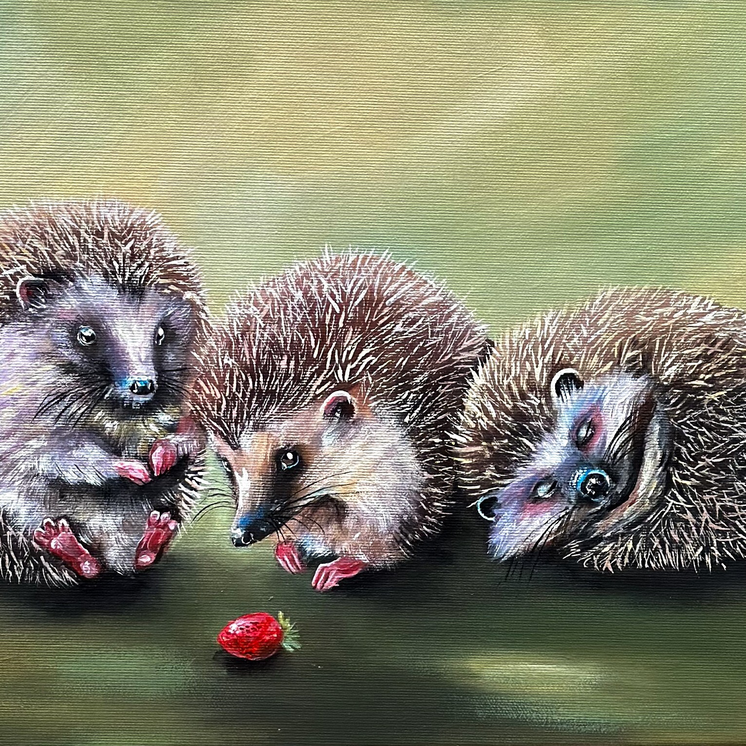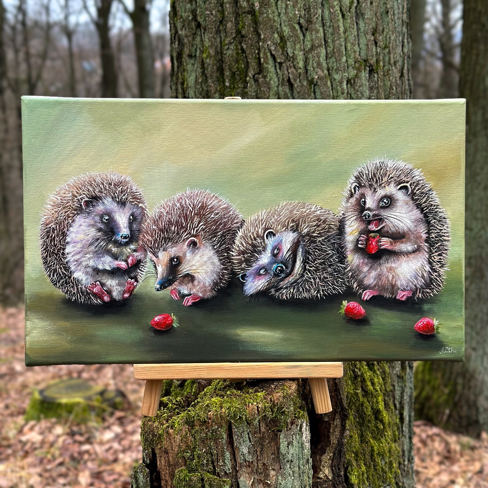 100% original painting on professional canvas, one-of-a-kind This exclusive hedgehog painting is made with professional acrylic paints on a stretched cotton canvas. Each of the four cuties is unique and emotional. The work is forest-like, filled with a wildlife nature mood and inspired by the forest nearby. A heart-melting gift for nature and animal lovers. Title: "Strawberry Lovers" Year: 2024 Size: 50 x 30 x 2 cm (about 20 x 12 x 0.8 inches) Materials: acrylic paints, stretched cotton canvas, glossy varnish. The painting is not framed, but the edges are also colored Please note, the colors may differ due to your monitor settings.