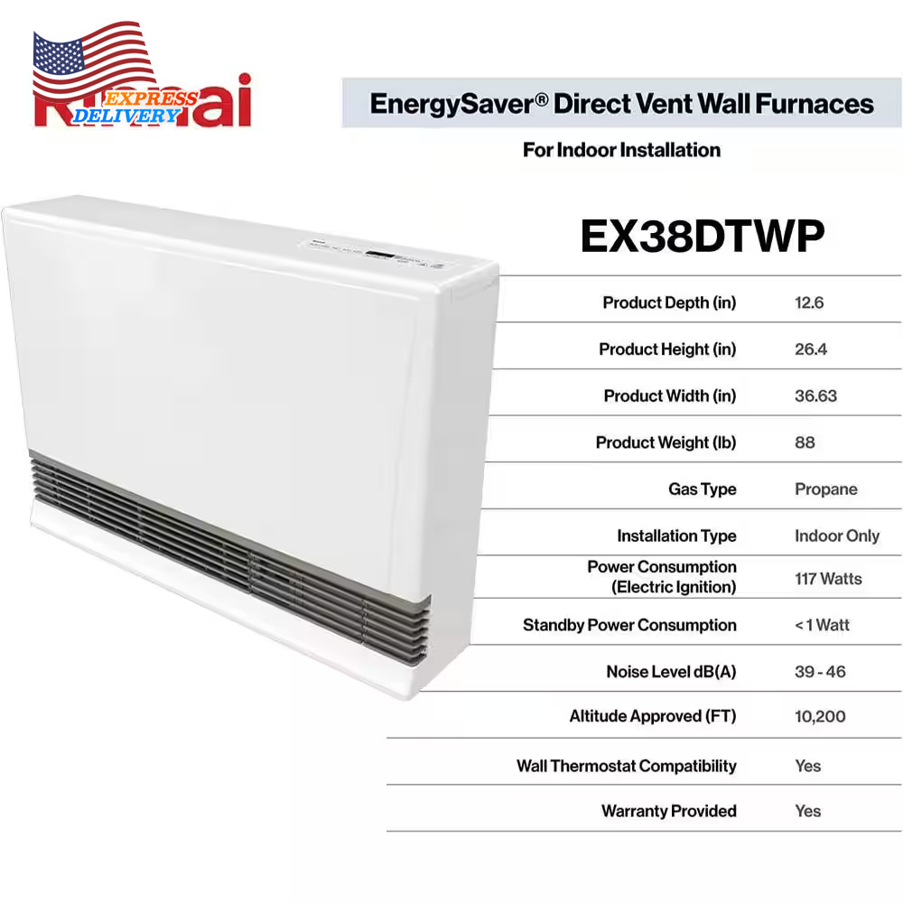 Store New Arrivals Add to Favorite View Feedback Contact Energysaver 36500 BTU Direct Vented Wall Furnace Propane Gas Heater FREE SHIP US Description Accessories Included Yes Annual Fuel Utilization Efficiency (AFUE) (%) 80 Area Heated (sq ft) 1473 sq ft Automatic shutoff Yes Color White Fuel Gauge No Fuel Type Gas Heat rating (BTU/hour) 36500 Btu/h Heater Controls Thermostat Heater Type Vented Heating Technology Type Convection Ignition Type Electrical Indoor/Outdoor Indoor Installation Surface Mounted Number of Heat Settings Variable Pack Size 1 Power/Fuel Type Propane Product Weight (lb) 86 lb Returnable 90-Day Room Size (sq ft) Greater than 900 Thermostat Yes Timer Included Yes Vented Yes Certifications and Listings CSA Certified,Energy Star Manufacturer Warranty 10-Year Heat Exchanger Warranty, 5 Year Parts, 2 Years Labor Connection Size 1/2" FNPT Product Depth (in) 12.6 in Product Height (in) 26.4 in Product Width (in) 36.63 in Input range 13,200 - 36,500 BTU/hour Save energy and money with modulating technology Cool-to-the-touch cabinet keeps you and your family safe EX38DTWP is a quick, flexible installed, ductless, propane gas, direct vent wall furnace from Rinnai. The perfect supplemental or specific zone heating solution that seeks out cold spots and within seconds begins to gently heat the room or space for maximum comfort. Wi-Fi enabled thermostat connection ready. ABOUT US We offer the best prices around on high quality products. Our E-store includes media such as books, movies, music and games while offering electronics, toys, sporting apparel, clothing, tools, general home, garden items and more. SHIPPING We are always working hard to ensure your package arrives as soon as possible. Please understand that some factors like weather, high postal traffic, and the performance of shipping companies are outside of our control. We offer free shipping to the lower 48 states and ship within 2 business days of payment, usually sooner. We do not accept P.O. Boxes. Please provide a physical address. For shipping outside of the continental USA, we only use eBay's Global Shipping Program.The item is shipped to KY and then sent to the rest of the world. International customers are responsible for all duties and taxes. Continue to check out in order to calculate costs for shipping the item to your country. Messages regarding eBay's Global Shipping Program MUST be directed at eBay EXCLUSIVELY. RETURNS We offer a 30-Day Return Policy on items which you are not completely satisfied with. You have the option for a full-refund or an exchange of the item. No returns are available on items shipped outside of the USA. PAYMENT We accept PayPal. CONTACT US This page content is yet to come Please ad us to your favorite seller and visit again later Thank You CUSTOMER SATISFACTION We try our very best to make sure every customer is completely satisfied. If there's a problem, message us! We're happy to help. WE ACCEPT Copyright © 2021 AutoDS. | All Rights Reserved