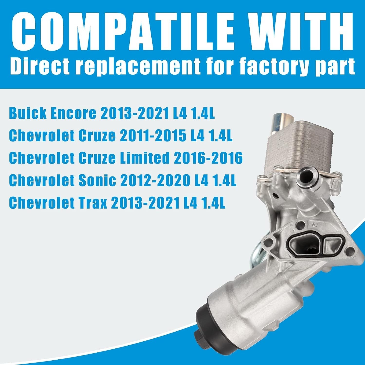 About this item 【OE Number】 55566784, 650039, 88179-91400, 55593189, 55594651, 55565385, 918-428. Please carefully check the OEM number, and compatible vehicle before purchasing. 【Fit Car Model】Compatible with Buick Encore 2013-2021;for Chevrolet Cruze 2011-2015,Cruze Limited 2016,Sonic 2012-2020,Trax 2013-2021 L4 1.4L 【Premium Material】Using enhanced high-quality materials, wear resistance, high temperature resistance, sealed and leak-proof, long service life. 100% Tested Before Shipping. 【Function】The engine oil cooler can keep the engine oil cool and clean, allowing the car to accelerate faster and helping to extend the life of the oil and engine. 【Buy with Confidence】If have any problem with this item, you can contact us, we will solve your problem within 24 hours. The Engine Oil Cooler Filter Housing is a performance part designed specifically for Buick Encore models from 2013 to 2021. This high-quality product, manufactured in the United States, fits perfectly into the vehicle and provides optimal filtration for the engine oil cooler. With dimensions of 12.28 x 7.4 x 4.92 inches and a weight of 2.83 pounds, this filter housing is a reliable and durable component for your car.