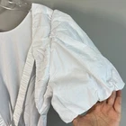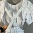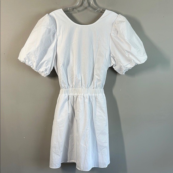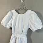 Fully lined Crisscross detail on back Side pockets Puff sleeves Elastic waist Pit to Pit - approx 19" Length - approx 37" Excellent preowned condition SRbin5.60