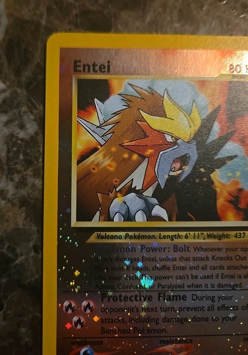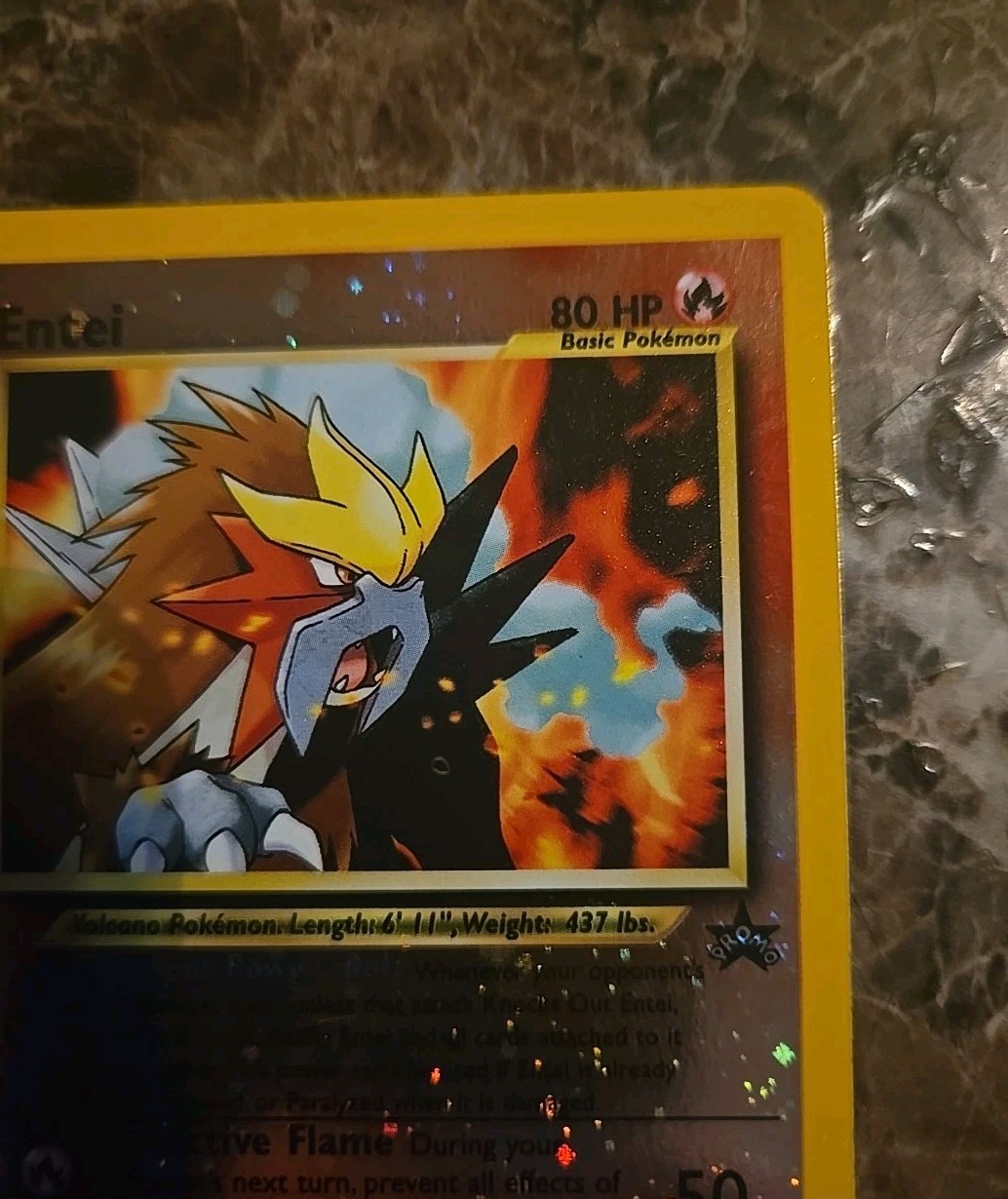 The Entei 244 WOTC Black Star Promo Reverse Holo Vintage Pokemon Card is a highly sought-after collectible for fans of the Pokémon TCG. This English-language card features the character Entei with 80 HP, part of the Wotc Promo set illustrated by Ken Sugimori. Though the card is classified as NM-/LP+ with a clean finish, its rarity and unique design make it a valuable addition to any collector's deck.
