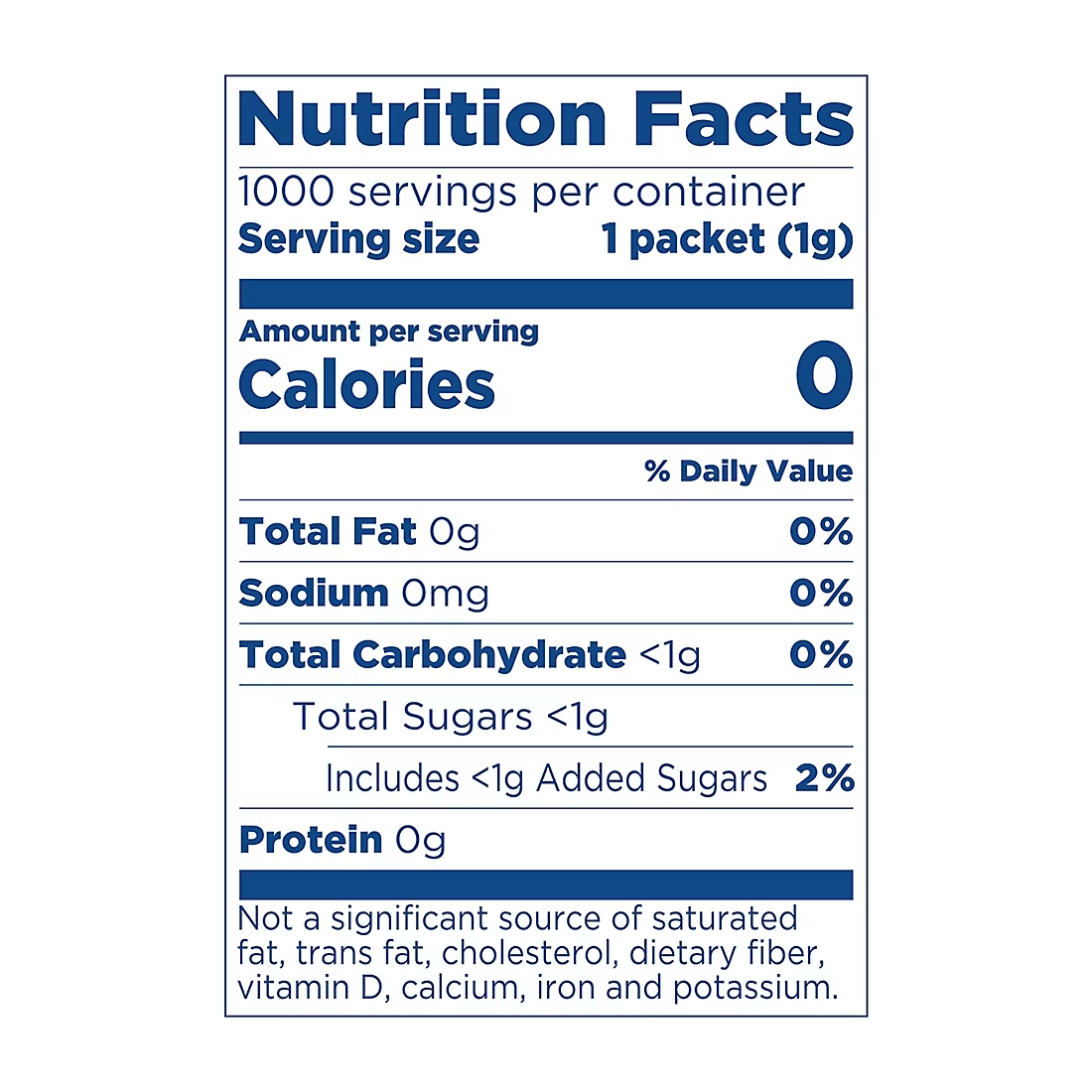 Product Features: Tastes like sugar 0 Calorie 1,000 packets Product made in USA using domestic and foreign sourced ingredients