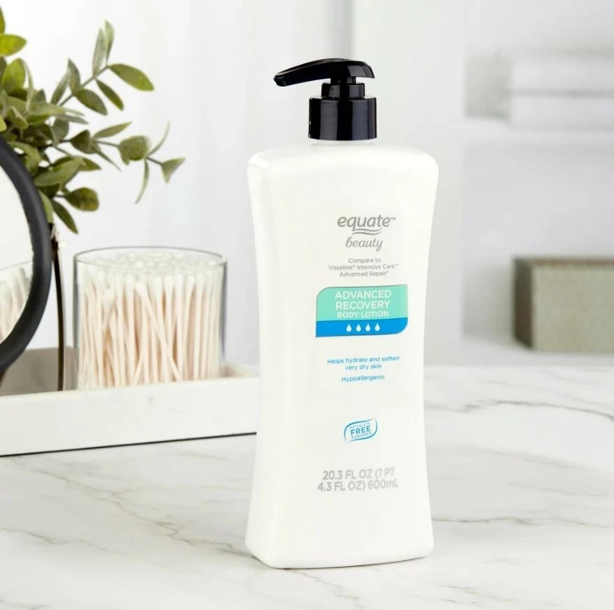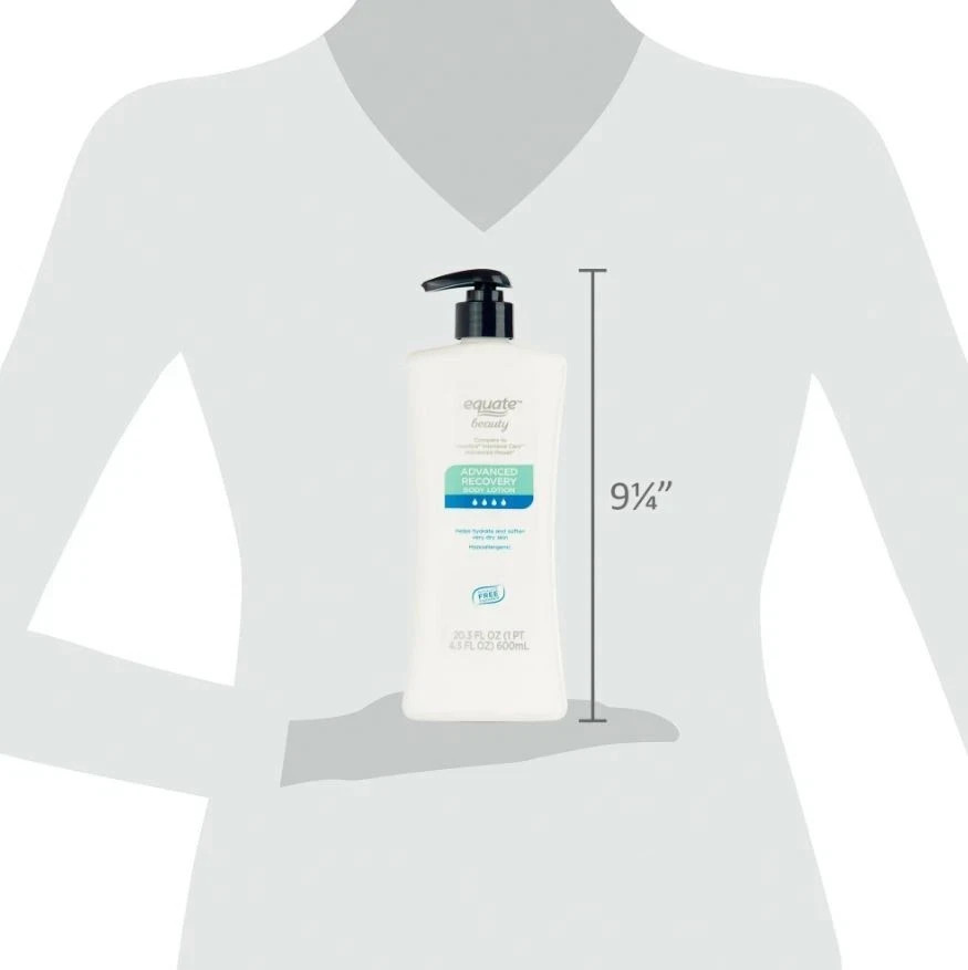 Product details Repair dry, cracked, and irritated skin with our Equate Beauty Advanced Recovery Body Lotion. Stress, poor nutrition, and even changes in seasonal weather patterns can take a toll on our complexion. That's why it's important to make sure you apply a high-quality moisturizer that will hydrate, soften, soothe, and protect your skin. Unlike other moisturizers, our unique formula is phthalate and paraben-free, hypoallergenic, and designed for even the most sensitive skin. Just smooth this lotion all over your body every day to reduce dryness and help hydrate your skin. Say goodbye to dry and hello to hydration with our Equate Beauty Advanced Recovery Body Lotion. Equate Beauty understands that beauty isn't just skin deep. With a large selection of the latest beauty products Equate Beauty helps you be your best you. Helps hydrate and soften very dry skin Phthalate and Paraben free Hypoallergenic formula is safe for sensitive skin Offers a triple moisture complex to help give you great results for your dry skin Ideal for use every day