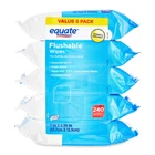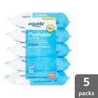 Equate Flushable Wipes, Fresh Scent, 5 packs of 48 wipes, 240 Total Wipes.... About this item Product details Equate Fresh Scent Flushable Wipes are soft, fresh-scented wet wipes that provide a gentle, effective clean for your skin. Traditional wet wipes are made from coarse fabrics that do not break down in water, which can potentially cause expensive damage to your septic system. Our wet wipes easily break apart after flushing, reducing the chance for blockages in waste management systems. An excellent choice for sensitive skin, these wet wipes are hypoallergenic and free of alcohol and parabens. They're also infused with vitamin E and soothing aloe extract, perfect for an ultra-moisturizing clean. These flushable wipes are great for any time you need a quick cleanup. This value pack contains five packages with 48 wipes each - totaling 240 wipes. The easy-to-use, resealable peeling packs ensure the wipes stay moist and allow for easy access whenever you need them. Wet wipes are better than dry tissue alone. Feel confident and refreshingly clean with Equate Fresh Scent Flushable Wipes.Making the right health decisions can be challenging. With a complete range of products and simple solutions, Equate allows you to take care of your family with confidence. Easy-dispensing wipes Alcohol free and hypoallergenic Soothing aloe and vitamin E 5 pack of 48 wipes each- totaling 240 wipes Equate Flushable Wipes, Fresh Scent, 5 Packs Of 48 Wipes, 240 Wipes Total Easy-dispensing wipes Alcohol free and hypoallergenic Soothing aloe and vitamin E 5 pack of 48 wipes each- totaling 240 wipes