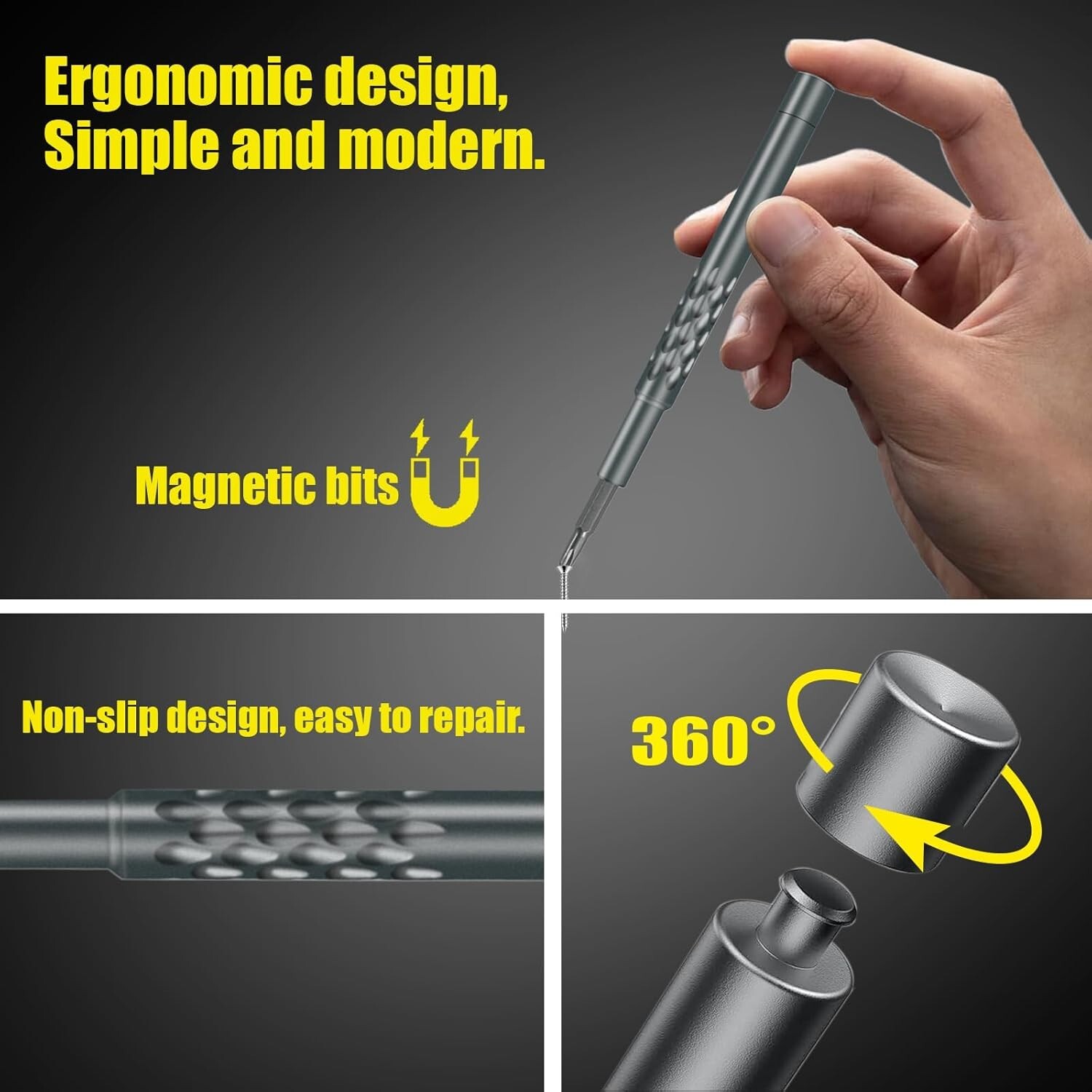Ergonomic 28-in-1 Screwdriver Kit - Perfect for Electronics and Eyeglass Repairs ‹ › ‹ › ‹ › ‹ › ‹ › ‹ › ‹ › ‹ › ‹ › Ergonomic 28-in-1 Screwdriver Kit Perfect for Electronics and Eyeglass Repairs Features: 28-In-1 Precision Screwdriver Set: Comes equipped with an extensive range of the most commonly used bits, including Philips, Flathead, Torx, Tri-point, and Pentalobe. It features sizes ranging from PH0000 to T20H, covering all your electronic repair needs. Portable and Lightweight: The oval storage design and compact shell make it easy to carry. Weighing just 170 g, it fits perfectly in your pocket or daily backpack. Comfortable Design: The ergonomic aluminum alloy handle minimizes hand fatigue, while the 360° rotating cover allows for precise control and maneuverability. Durability: Constructed with high-quality CRV steel, the cutter head offers exceptional hardness and precision. The magnetic design keeps small screws securely in place during repairs. Wide Application: Ideal for electronic repairs and hobbies, this screw kit is perfect for phones, computers, laptops, watches, cameras, game consoles, tablets, and even eyeglasses. Benefits: Versatile for a broad range of applications. Easy to store and transport. User-friendly ergonomic design reduces strain. Durable materials ensure longevity and reliability. Magnetized tips prevent loss of screws, enhancing efficiency. Why choose our Ergonomic 28-in-1 Screwdriver Kit? Elevate your repair game with our Ergonomic 28-in-1 Screwdriver Kit, designed for experts and hobbyists alike. With a tool that fits comfortably in your hand, you'll experience unprecedented precision and control, making every repair effortless. Each bit is either magnetic or securely locked, allowing you to focus entirely on the task at hand—no more struggling to hold tiny screws in place. Whether you are a technician, a DIY enthusiast, or simply need to tackle occasional repairs at home, this screwdriver set is your ultimate companion. Invest in durability, comfort, and versatility; order yours today! Shipping Free & Fast Shipping - We offer free shipping to most of the USA with a normal delivery time of 3-7 days. However, due to the current situation, additional delivery time (up to 3 weeks) may be required for some items. Alternative Carriers - We may use alternative carriers (e.g. USPS, FedEx, UPS, etc.) to ensure your package arrives safely and on time. Due to the use of multiple carriers, we are unable to provide a tracking number automatically. Handling Time - Orders are processed and shipped within 1-2 business days of receiving cleared payment. Shipping Restrictions - Shipping to Alaska, Hawaii, Puerto Rico, Guam, and other US territories may incur shipping charges or delivery restrictions. Please contact us before ordering, or your order can be refunded/cancelled. State Restrictions - There may be restrictions based on your state of purchase. For example, certain items may not be shipped to California due to state regulations. Contact for Tracking Updates - If you require tracking updates or have any concerns about the delivery of your order, please feel free to contact us, and we will be happy to assist you. Return 30-Day Hassle-Free Returns - We want you to be completely satisfied with your purchase. If you are not, you can return the item within 30 days of receiving it for a full refund or exchange. Easy Return Process - To start a return, simply contact us and we will provide you with a prepaid return shipping label and detailed instructions. Restocking Fee - There are no restocking fees for returns. However, the buyer is responsible for return shipping costs if the return is not due to a seller's error. Refund Processing Time - Refunds will be processed within 5 business days of receiving the returned item in its condition. Payment We accept all major credit cards, PayPal, and Apple Pay for your convenience. Your payment information is secure and encrypted to ensure a safe and seamless transaction. Please complete your payment within 3 days of purchase to avoid any delays in shipping. Feedback Your feedback is extremely important to us. We strive to provide the best products and customer service possible. If you are satisfied with your purchase, please take a moment to leave us a positive review. If you have any concerns or issues with your order, please contact us before leaving negative feedback. We are committed to resolving any problems and ensuring your satisfaction. Contact Us If you have any questions or concerns, please feel free to out to our customer support team. You can contact us through the eBay messaging system. We are available Monday to Friday, 9:00 am to 5:00 pm EST, and we will do our best to respond to your inquiry within 24 hours. Buy it now and enjoy a pleasant shopping experience! Model: Eyeglass Screwdriver Set Item Width: Eyeglass Screwdriver Set Item Length: Eyeglass Screwdriver Set Item Height: Eyeglass Screwdriver Set Item Weight: 200 grams Unit Quantity: 1.0 Features: Ergonomic Handle,Portable,Lightweight,Magnetic Tip,Square Shaft,360° Rotating Cover Material: Plastic,Tool Steel,Aluminum Alloy Type: Precision Screwdriver Set Drive Type: Mixed Set Number of Pieces: 28 Star Size: T1 System of Measurement: Metric Color: Grey
