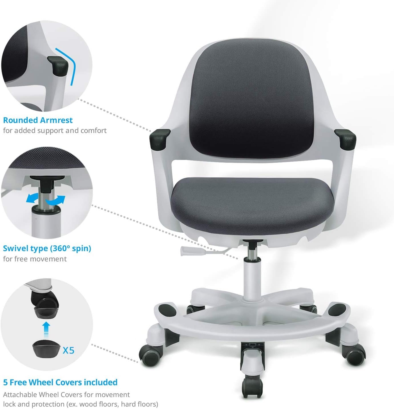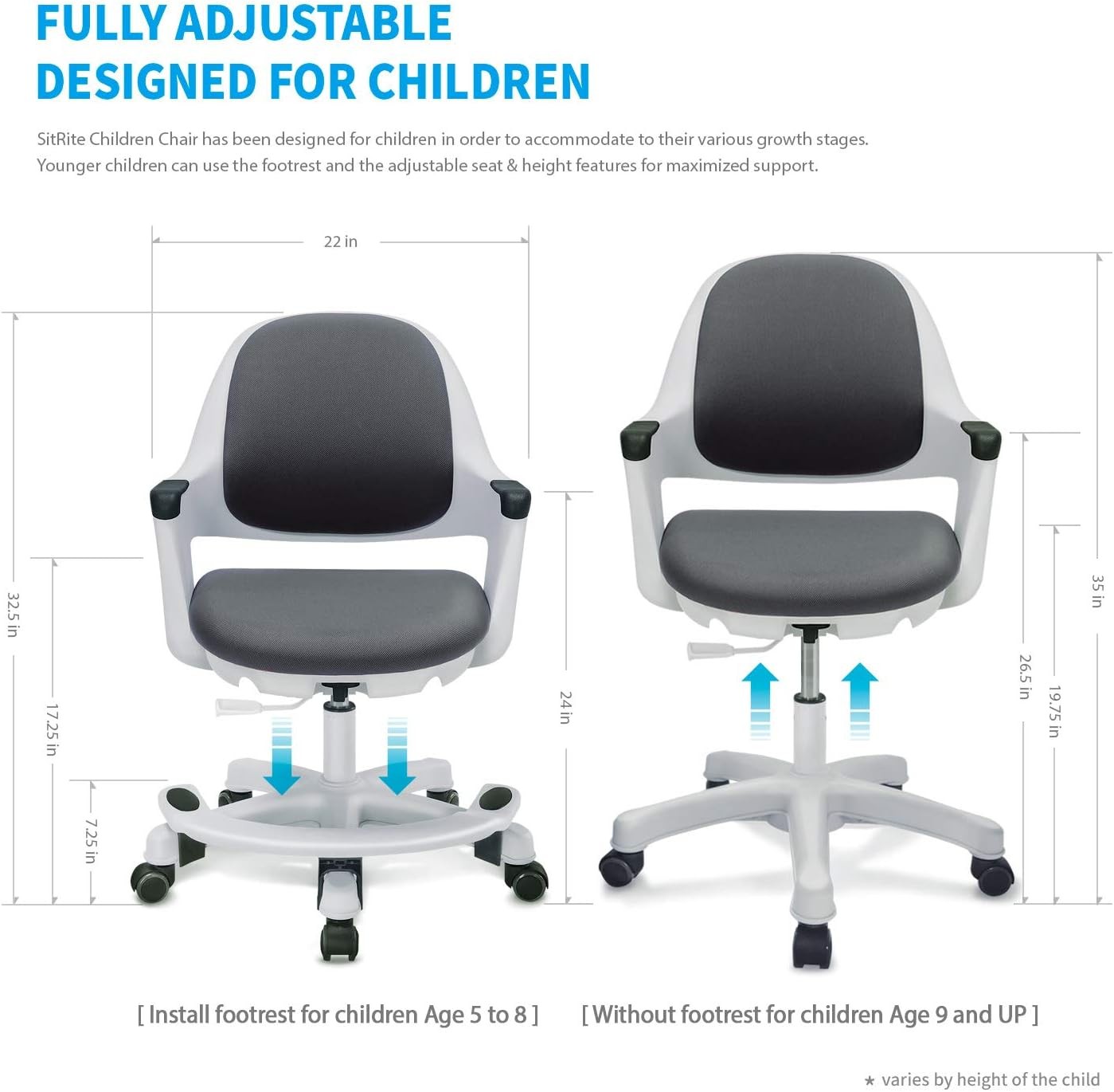Ergonomic Kids Desk Chair, Lumbar Support Study Task Chair Cyber Grey Product Details Brand: SitRite Color: Cyber Grey Product Dimensions: 18"D x 17.5"W x 18"H Back Style: Upgraded Cushion Special Feature: Kids Desk Chair Product Care Instructions: Wipe Clean Unit Count: 1.0 Count Recommended Uses For Product: Office Maximum Weight Recommendation: 300 Pounds Style: Modern Pattern: Solid Room Type: Kids Room, Game Recreation Room, Study Room Age Range (Description): Child Included Components: Foot Rest Shape: Round Model Name: SRCHRB100PK_AM Arm Style: Rounded Surface Recommendation: Hard Floor Seat Back Interior Height: 15.25 Inches Furniture base movement: Swivel Indoor/Outdoor Usage: Indoor Seat Height: 18 Inches Seat Depth: 18 inches Fill Material: Foam Leg Style: Tapered Leg Reclining Position Count: 1 Tilting: No Number of Cup Holders: 1 Chair Backrest Width: 15 Inches Form Factor: Plastic Manufacturer: Worldshoppe Item Weight: 22.6 pounds Item model number: SRCHRB100 Brand: SitRite Color: Cyber Grey Product Dimensions: 18"D x 17.5"W x 18"H Back Style: Upgraded Cushion Special Feature: Kids Desk Chair MaterialItem Weight: Plastic22.6 Pounds Frame MaterialSeat Material Type: PlasticPlastic Ergonomic Design for Kids: Our Kids Desk Chair is crafted to support your child's natural posture, ensuring comfort during Study or play. It's the Ergonomic Kids Computer Chair for long hours of use Adjustable Features for Growing Kids: This Kids Office Chair is equipped with Adjustable Height settings, making it suitable for Children of various ages and sizes. It grows with your child, providing consistent comfort and support Stationary Option with Wheel Covers: For those who prefer a non-mobile option, our Chair comes with wheel covers that prevent the Wheels from moving. This ensures stability and safety for younger Children who may find a wheeled Chair challenging Comfortable and Supportive: With padded seating and a supportive backrest, this Kids Study Chair ensures your child remains comfortable. The Chair with Arms offers additional support, perfect for maintaining a good posture during Study sessions Versatile Use at Home and School: Whether used as a Kids Desk Chair, a Computer Chair, or a Study Chair, it’s designed to meet all your child’s needs. The durable construction ensures it lasts through various stages of your child’s growth, supporting them through different activities