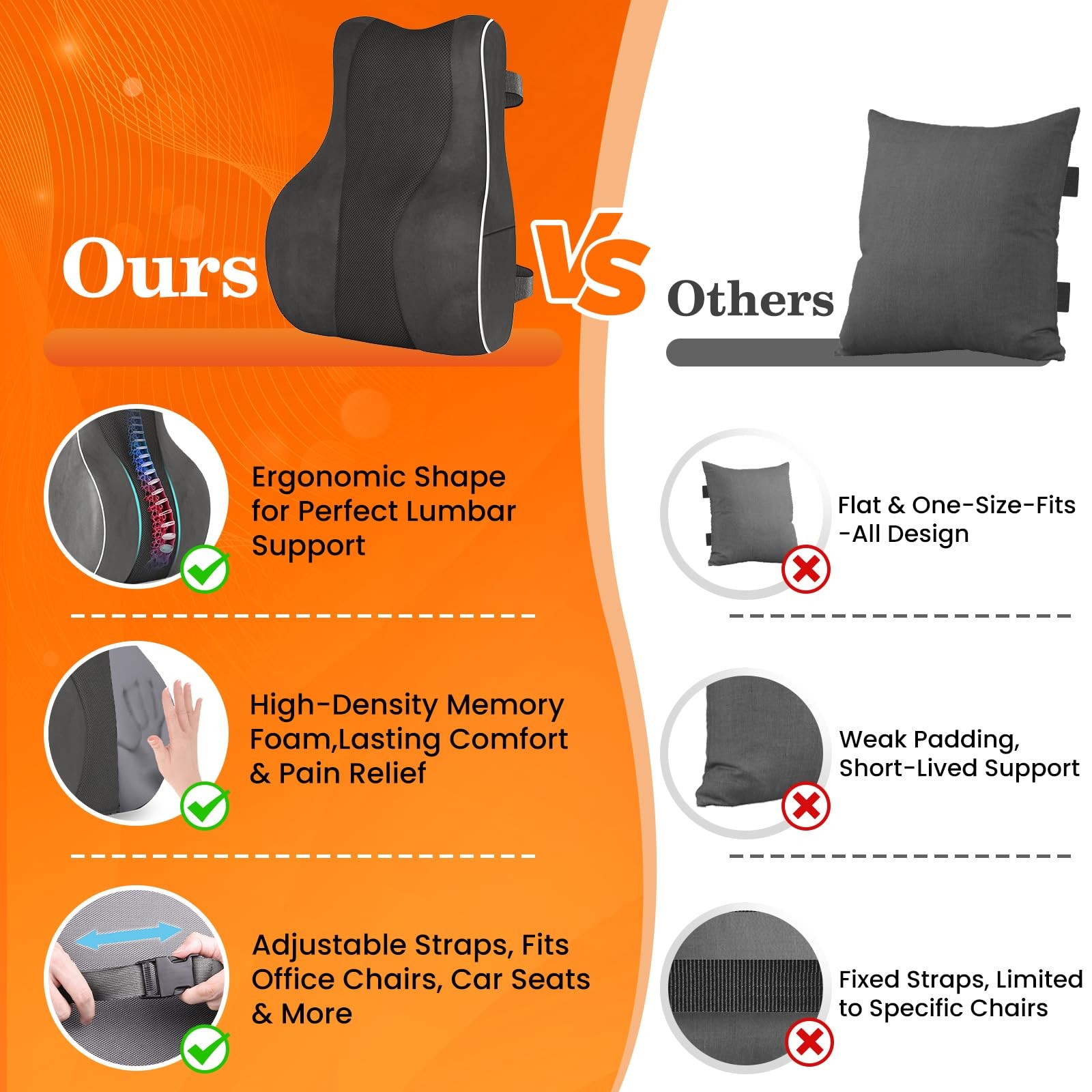 lumbar support pillow is your ultimate solution for back pain relief during extended periods of sitting. First, its ergonomic pear shape hugs your spine’s natural curve, alleviating stubborn lower back discomfort, hip ache, and neck tension caused by poor posture. Unlike ordinary lumbar pillows that lose support after a few weeks, our lumbar support pillow, crafted with high - density memory foam, maintains its shape and support even after 6 months of daily use. Second, this high - density memory foam ensures long - lasting support without flattening, providing consistent comfort. Third, the breathable cover ensures a refreshingly cool sitting experience, preventing any sweaty discomfort. Finally, the adjustable straps securely fasten it to office chairs, cars, or sofas, making it an ideal choice for office workers, drivers, or anyone who endures long hours of sitting. Whether you're stuck at your desk, behind the wheel, or relaxing on the sofa, is here to support your back. Unrivaled Comfort for Diverse Settings: Are you tired of discomfort from long hours at the office, in the car, or gaming? Our Lumbar Support Pillow is engineered for ultimate comfort across office chairs, car seats, and gaming seats. Its ergonomic design, shaped like a pear, hugs your spine's natural curve, effectively relieving upper, mid, and lower back pain. Ideal for extended sitting periods, it ensures you can focus on your tasks without the distraction of backache Superior Memory Foam for Lasting Relief: Most lumbar pillows lose their shape over time, but our high - density memory foam can maintain its form even after months of daily use, supporting users weighing 100 - 200 lbs without deformation. This premium foam molds to your body within seconds, providing continuous, targeted support that eases lower back pain and promotes proper posture. Whether you're dealing with work projects, on a long drive, or immersed in a gaming session, our pillow offers ultimate comfort Secure Fit with Adjustable Straps: Worried about your lumbar pillow slipping out of place? Our back pillow features double adjustable straps that ensure a stable fit on any office chair, car seat, gaming chair, train seat or plane seat. The anti - slip bottom further enhances stability, allowing you to move freely without the pillow shifting. This secure - fit design keeps your back in proper alignment, reducing strain and providing consistent support throughout the day Breathable Mesh Cover for Freshness: Sweating and discomfort from prolonged sitting are a thing of the past. The high - quality breathable mesh cover of our Lumbar Support Pillow actively circulates air, keeping your back dry and cool. No more sticky, uncomfortable sensations. Plus, the smooth - operating premium zipper makes it easy to remove the cover for cleaning, ensuring your pillow stays fresh, no matter how often you use it Versatile Design for Home and Beyond: Designed with versatility in mind, our lumbar support pillow is not only perfect for office, car, and gaming use but also a great addition to your home. Its 18.1”(longest) x 16.5”(widest) x 5.5”(thickest) size makes it suitable for various home seating options, from dining chair to big seating space. The stylish color and ergonomic design blend seamlessly with any decor, while providing the same level of back - pain - relieving support you expect. Experience the convenience and comfort of a multi - purpose lumbar support pillow that caters to all your sitting needs