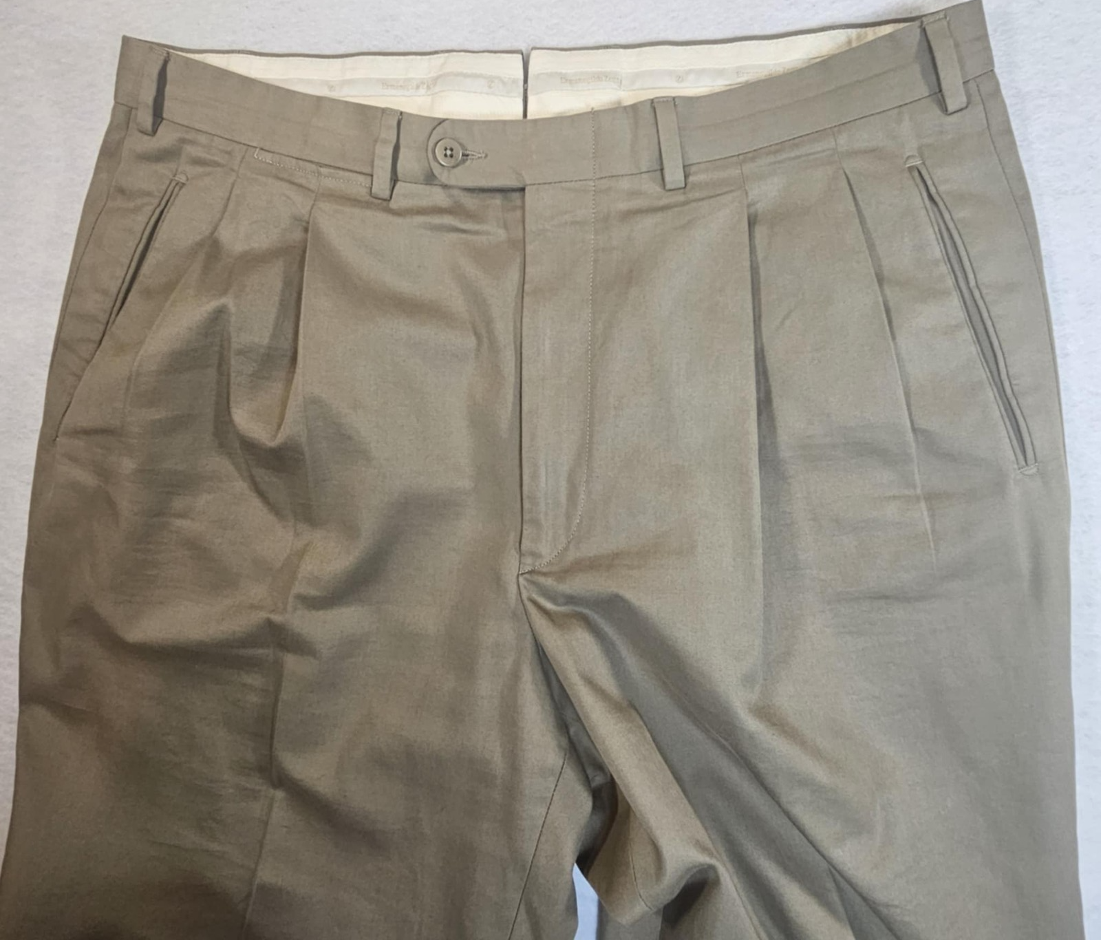 Grab these classic Ermenegildo Zegna men's khaki pleated chinos! Made from 100% cotton and partially lined in the front, they offer superior comfort and a timeless look. In excellent condition, these versatile chinos are perfect for smart-casual or more formal wear. Product Details: Brand: Ermenegildo Zegna Color: Khaki Size: Men's 38 Fit: Pleated Material: 100% Cotton, partially lined Condition: Excellent Please note: We work full times jobs. Response time is limited to weekends and weekdays before 7AM and after 5PM CST