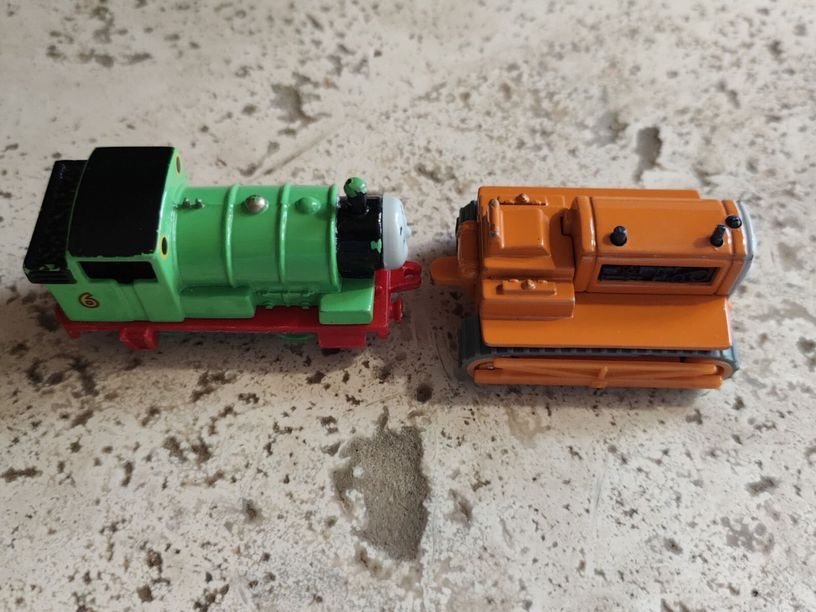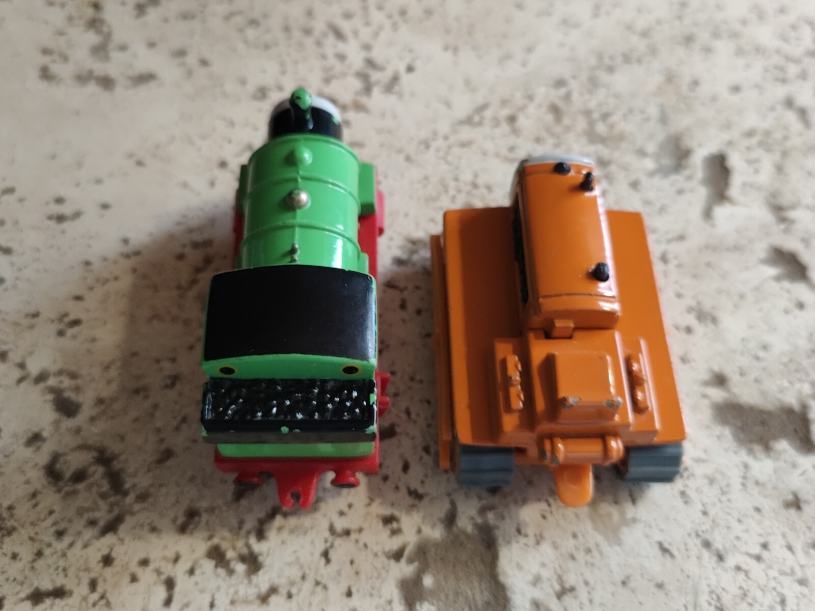 The product is a lot of two Ertl diecast metal action figures from the Thomas & Friends franchise. The lot includes Terence, a character complete with treads, and Percy the green train engine. Both are preowned items showing typical signs of wear from age, use and storage.