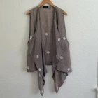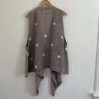 Eskandar Linen Long Line Open Front Lagenlook Vest Cardigan Duster Size 1 - US 10 12 See measurements to ensure fit as this could fit larger than a 10 -12 Made in England beautiful Lagenlook linen open front sleeveless cardigan with an asymmetrical hem Light Brown/Dark Tan color Condition: Great Preloved - I fixed a couple of snags so the thread is visible on the inside of the garment Keep in mind that linen has natural knots so there are some in the fabric. Approximate Measurements laid flat Armhole Length: 14.5” Length 27” - 41” Lagenlook, linen, longline, boho, coastal grandma, contemporary, minimalist, layer