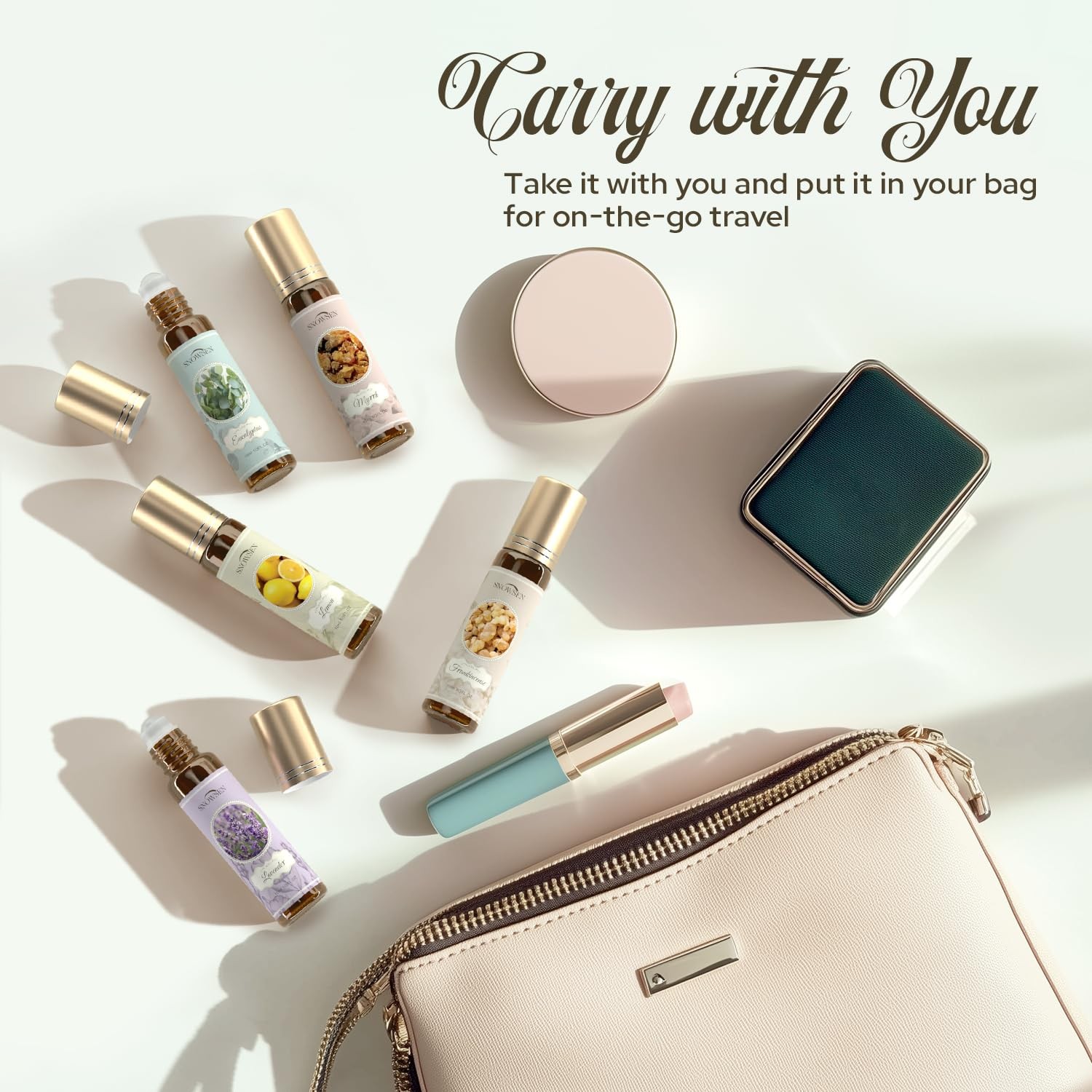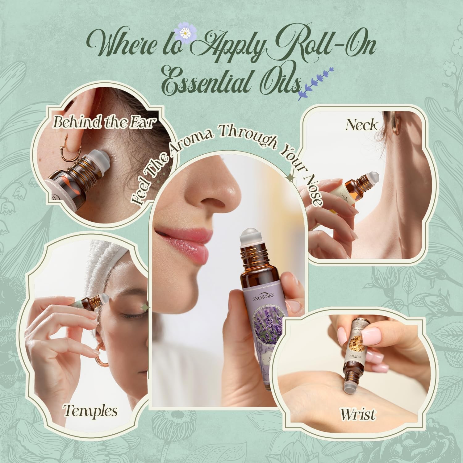 Essential Oil Roll On Set This essential oil roll on set includes 6 x 10ml bottles, each with a convenient glass rollerball for easy, mess-free application. Whether you’re at home, at work, or on the go, these portable roll-ons provide the perfect aromatherapy experience whenever you need it. Each essential oil is carefully crafted to offer specific benefits, so you can choose the right one for your mood and needs. Lavender: Promotes relaxation and helps improve sleep quality. Its soothing aroma also helps reduce daily stress and anxiety. Peppermint: Refreshes and clears your mind, enhancing focus and mental clarity. It also helps relieve fatigue. Frankincense: Known for its calming and grounding properties, it supports emotional balance. Eucalyptus: Aids in breathing and mental clarity. Lemon: Boosts energy, enhances focus, and uplifts your mood with its refreshing, citrus scent. Myrrh: Helps calm stress, leaving you feeling centered and balanced. Aromatherapy On-The-Go Take the power of aromatherapy with you everywhere. These roll-on bottles are the perfect size for your purse, gym bag, or travel kit, giving you easy access to the refreshing benefits of essential oils whenever you need them. Skin-Friendly & Pure Crafted from 100% pure plant-based ingredients, this essential oil set is blended with natural carrier oils for a skin-friendly, non-greasy application. Apply to pulse points such as your wrists, chest, or behind your ears for a refreshing, soothing experience. Perfect Gift for Wellness Enthusiasts This essential oil roll on set makes an ideal gift for anyone who loves self-care. It’s perfect for birthdays, anniversaries, holidays, or as a thoughtful gesture for someone who enjoys natural aroma. Essential Oil Roll On Set: This essential oil roll on set includes 6x10ml bottles, each with a convenient glass rollerball for easy, targeted application. The set features Lavender roll on oil, Peppermint roll on oil, Frankincense roll on oil, Eucalyptus roll on oil, Lemon roll on oil, and Myrrh roll on oil. On-The-Go Aromatherapy Relief: The compact size and roll-on design make these aromatherapy oils ideal for carrying with you wherever you go. Apply them to your wrists, temples, chest, temples, palms, soles of feet and behind ears or pulse points for refreshing, stress relief, smooth breathing, or focus. FOR EXTERNAL USE ONLY! Pure, Skin-Friendly Essential Oils: Each oil in this essential oil set is made from 100% pure plant-based ingredients, blended with natural carrier oils for safe and effective use on the skin. These oils are gentle, non-greasy, and absorb quickly, offering a smooth, skin-friendly aromatherapy experience with no mess. Multi-Benefit Essential Oils: Lavender essential oil roll-on helps you unwind and enjoy a restful sleep. Peppermint essential oil refreshes and clears your mind, perfect for focus. Frankincense oil supports emotional balance and relaxation. Eucalyptus oil promotes easy breathing and mental clarity. Lemon oil revitalizes your mood, boosting energy and focus. Myrrh oil calms stress and promotes a peaceful, centered feeling. Perfect Gift for Wellness Enthusiasts: The essential oil roll on set makes an ideal gift for anyone who enjoys natural wellness and self-care. With its elegant design and benefits, it’s the perfect present for birthdays, anniversaries, holidays, or as a thoughtful gesture for a loved one looking to enhance their wellness journey.