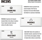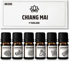 Essential Oils Set Chiang Mai Series Set of 6-100% Pure Oils kit Cinnamon, Sandalwood, Frankincense, Peppermint, Lemongrass, Bergamot 10ML Suitable for Candle Making, Fresh fragrances Diffuser Product Details Product Dimensions : 3.2 x 1.2 x 7.85 inches; 10.23 ounces Manufacturer : INCENS Brand: INCENS Scent: Sandalwood, Lemongrass, Peppermint, Cinnamon, Frankincense Special Feature: Pure Product Benefits: Relaxation, Aromatherapy, Mood Support, Revitalizing Seasons: All Seasons 【SET OF 6 ESSENTIAL OILS】: This package includes Cinnamon, Sandalwood, Frankincense, Peppermint, Lemongrass, and Bergamot essential oils . 【OIL USES】:Our essential oils serve a multitude of purposes, enriching our lives in various ways. They are perfect for aromatherapy, infusing spaces with calming scents or revitalizing fragrances. In DIY projects, they're great for crafting aromatic candles, adding a personal touch to any space . 【SMELL SURROUNDING】: Only 2~4 drops of essential oils are needed to make your diffuser smell good and keep the scent for a long time, as if you are in a peaceful country garden in Thailand . 【100% NATURAL】: All the oils in this set are pre-diluted natural ingredients that we obtained from our own plants. They does not contain perfume or synthetic additives . 【OUR PROMISE 】:we continue to research and source new products and fragrance oil kits that meet our customer's' growing needs. For any questions regarding proper usage in products please contact us . Set Of 6 Scents - Including Cinnamon, Sandalwood, Frankincense, Peppermint, Lemongrass, and Bergamot.Indulge in the essence of our essential oils.transporting you to the serene countryside gardens of Chiang Mai in Thailand. Embrace the aromatic blend reminiscent of Southeast Asia's unique fragrances, where the scents of fresh grass and sandalwood intertwine, offering a sensory journey that captivates the spirit and soothes the soul
