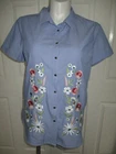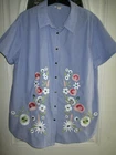 EST. 1946 WOMEN'S SIZE LARGE BLUE & WHITE PIN STRIPE EMBROIDERED FLORAL PRINT ROUND HEM SLIGHTLY LONGER IN BACK 100% COTTON CHEST UNDERARM TO UNDERARM 20" LENGTH FROM SHOULDER TO HEM 28" BACK 30" EXCELLENT CONDITION SMOKE & PET FREE HOME