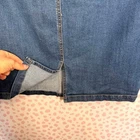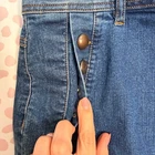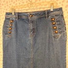 Classic denim pencil skirt features a nautical-inspired aesthetic with decorative bronze-tone buttons along the front hips. Crafted from a comfortable stretch denim blend, this knee-length piece includes a traditional zip fly with button closure, functional belt loops, and two rear patch pockets. A subtle back vent ensures ease of movement while maintaining a sleek, tailored silhouette. Keywords: Nautical, Sailor, Military, Pencil Skirt, Denim Skirt, Stretch, Classic, Casual, Office Wear, Preppy, Retro, Bronze Buttons, Blue Jean Skirt, Knee Length, Est 1946 Denim
