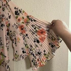 Lightweight floral blouse offers a feminine silhouette with its soft pink base and vibrant peach and green botanical print. The standout feature is the tiered, pleated bell sleeves that add dramatic movement and texture to the design. Crafted from a smooth woven fabric, it has a comfortable V-neckline and a relaxed fit through the body, making it an ideal choice for both professional settings and weekend outings. Measurements: • Pit to Pit: 25" (50" doubled) • Length: 28" Brand: Est. 1946 Style: Tiered Pleated Bell Sleeve Blouse Color: Pink, Peach, Green, Black Pattern: Floral Neckline: V-Neck Sleeve Length: 3/4 Sleeve Material: 100% Polyester Fit: Relaxed Occasion: Career, Casual Theme: Cottagecore, Romantic Size Type: Plus Size: 18/20W Keywords: Boho, Shabby Chic, Garden Party, Flowy, Feminine, Office Wear, Spring, Summer, Flounce Sleeve, Botanical, Whimsical, Plus Size Fashion, Retro Inspired, Lightweight