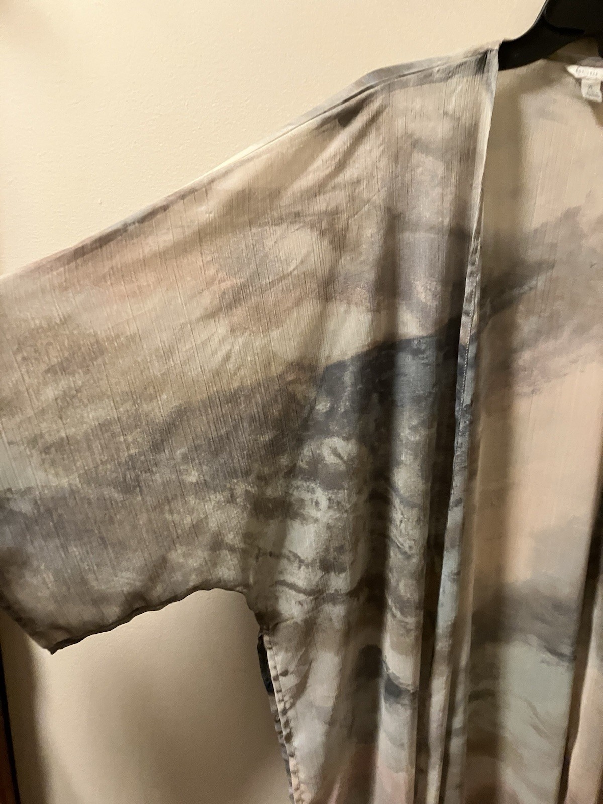 Open front sheer kimono cardigan from Est. 1946. Artsy abstract pattern in soft pastel shades should go with black, gray or blues. Size XL. Measures 26” pit to pit and 40” in length. Side slits measure 21”.