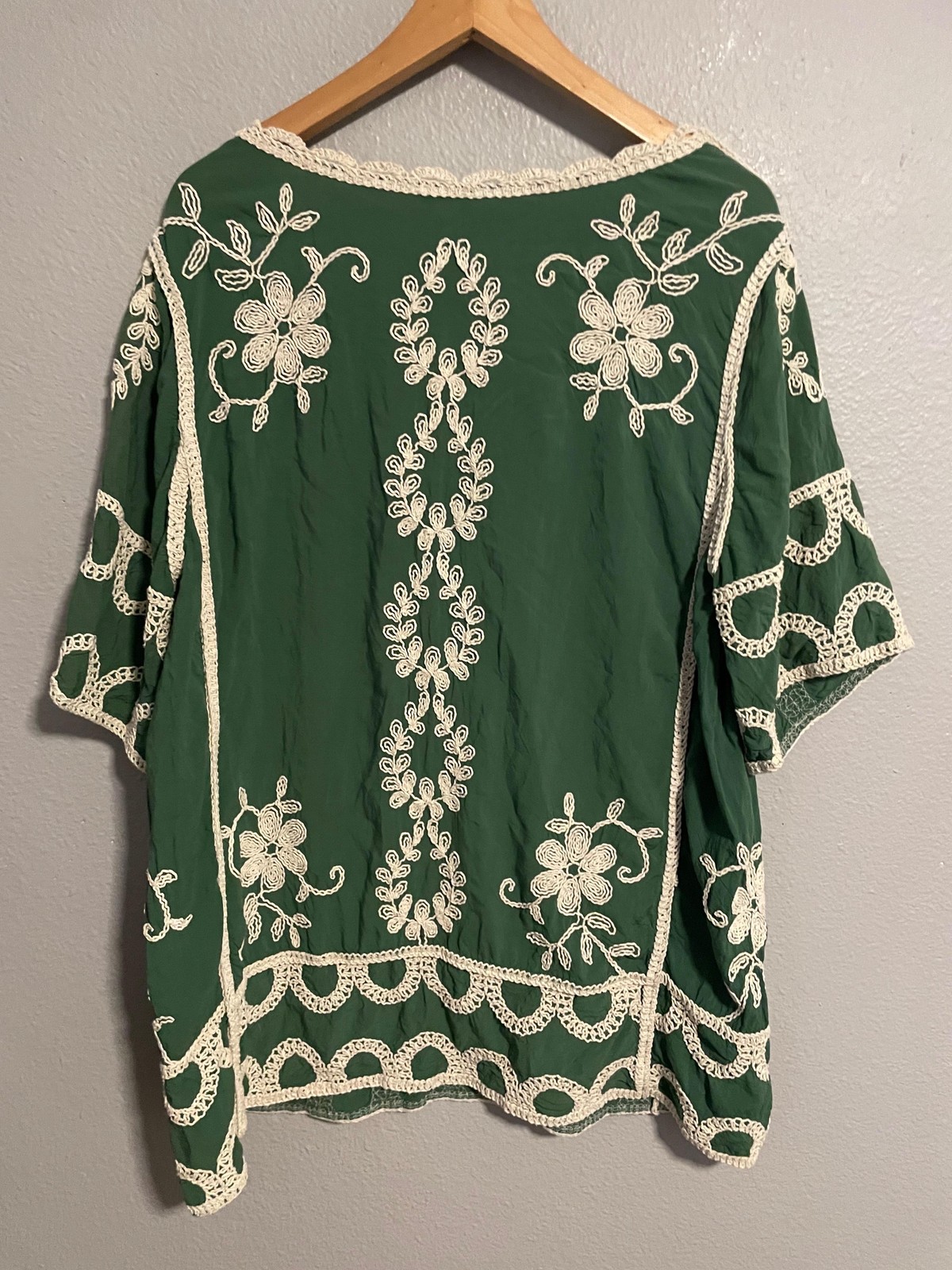 Brand: EST. 1946 Item: Womens short sleeve shirt / tunic top with boho embroidered design. Color: Deep green with cream crochet lace trim and floral embroidery. Size on tag: 18/20W (plus size). Materials: Body 100% rayon; embroidery 100% cotton (per tag RN37080). Made in China. Design details: Scoop neckline, crochet lace trim at neckline, sleeves and hem, decorative floral embroidery front and back, relaxed fit pullover style, unlined lightweight woven fabric. Condition notes: Light general wear and wrinkling from storage, and a small dark spot on the back near the neckline as shown in photos. No additional measurements are provided beyond the size on the garment tag.