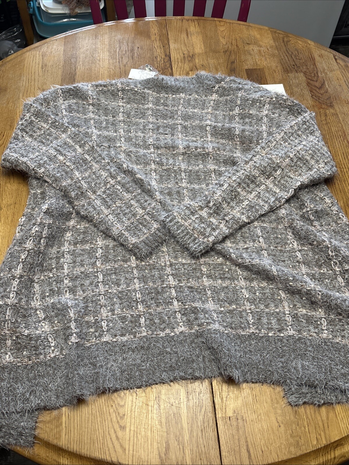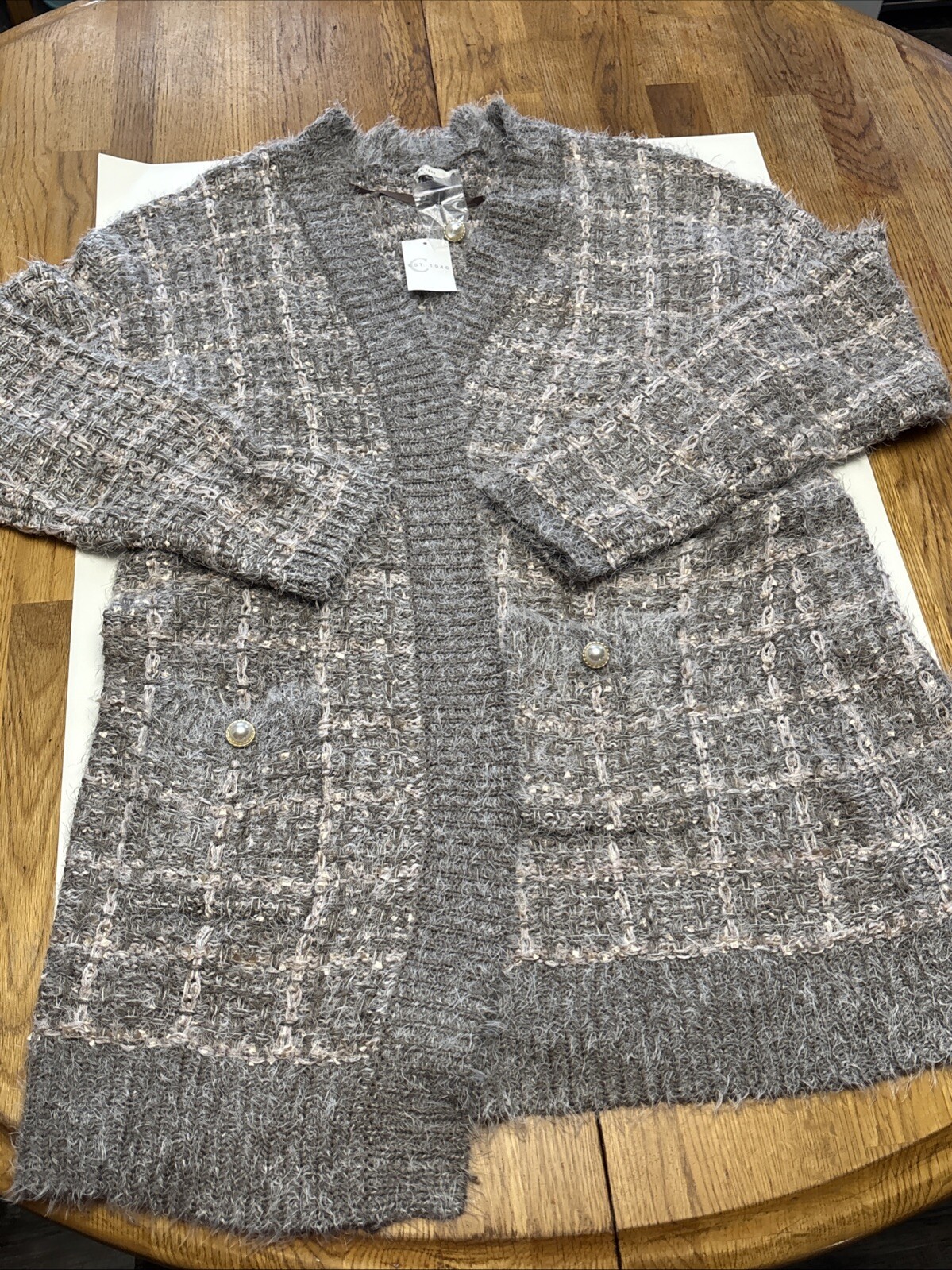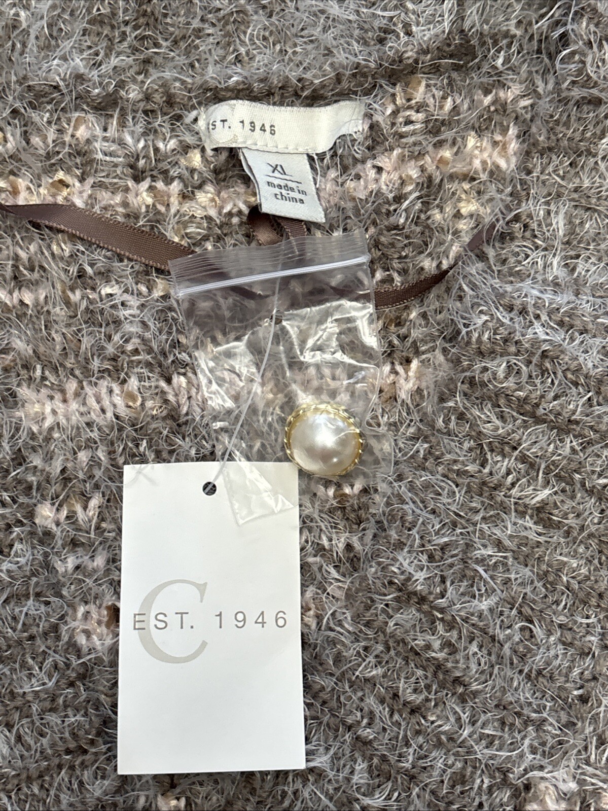 A women's tweed jacket from Est 1946 in size XL, featuring an open front style with long sleeves. The mid-length jacket is made of gray microfleece fabric, suitable for winter, fall, and spring occasions like parties, casual outings, and workwear. It is machine washable and has a regular fit, making it a stylish and versatile addition to any wardrobe.