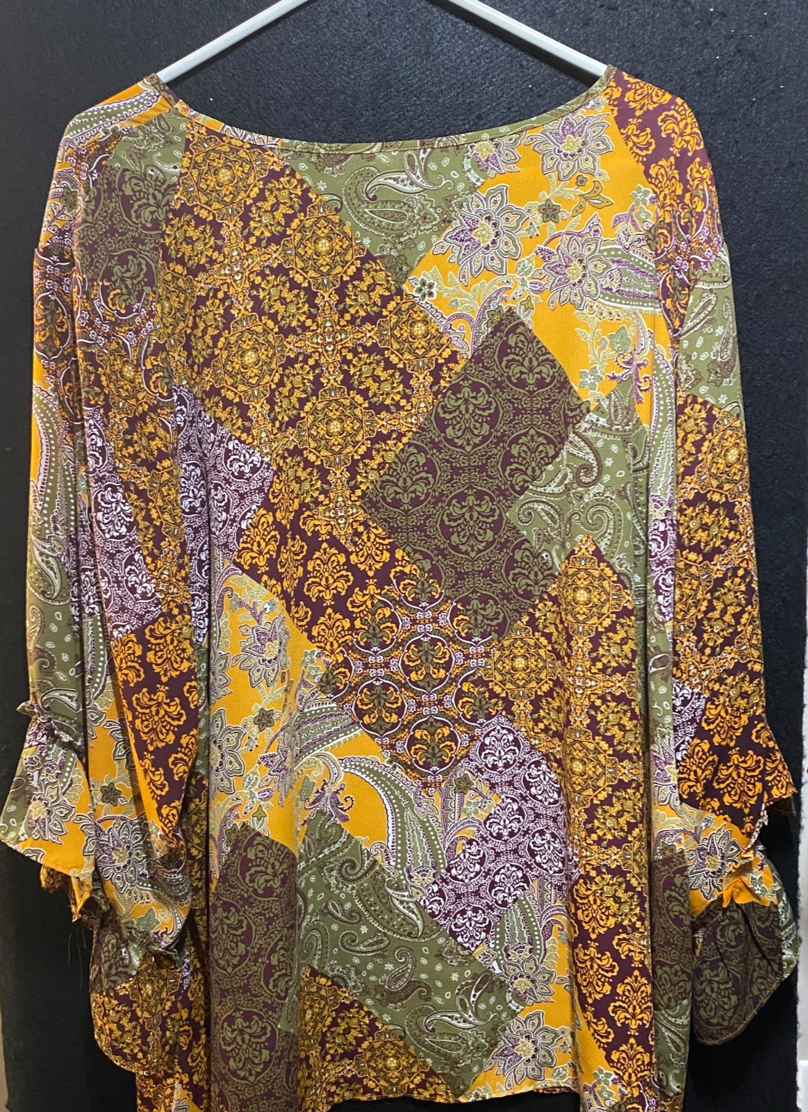 The Est. 1946 Women's Size 26/28W Top with 3/4 Sleeve Ruffle is a colorful floral blouse perfect for casual occasions. Made of lightweight polyester material, this relaxed fit top features a V-neckline and bell sleeves with ruffle accents. The pullover closure and machine washable fabric make it easy to wear and care for. Ideal for summer, fall, and spring, this plus size blouse from Est. 1946 is a stylish choice for women looking for a basic yet trendy addition to their wardrobe.