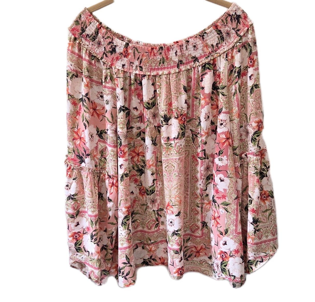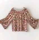 This Est 1949 top is a women's XL floral blouse with 3/4 sleeves and an off-the-shoulder neckline, perfect for a casual and romantic look. Made of lightweight chiffon polyester material, it features a colorful multicolor floral pattern and bell sleeves, making it ideal for summer, fall, and spring seasons. The pullover closure and regular fit add to the comfort and ease of wearing this blouse for everyday wear. Easy to care for with machine washable fabric, this blouse is a stylish addition to any woman's wardrobe.