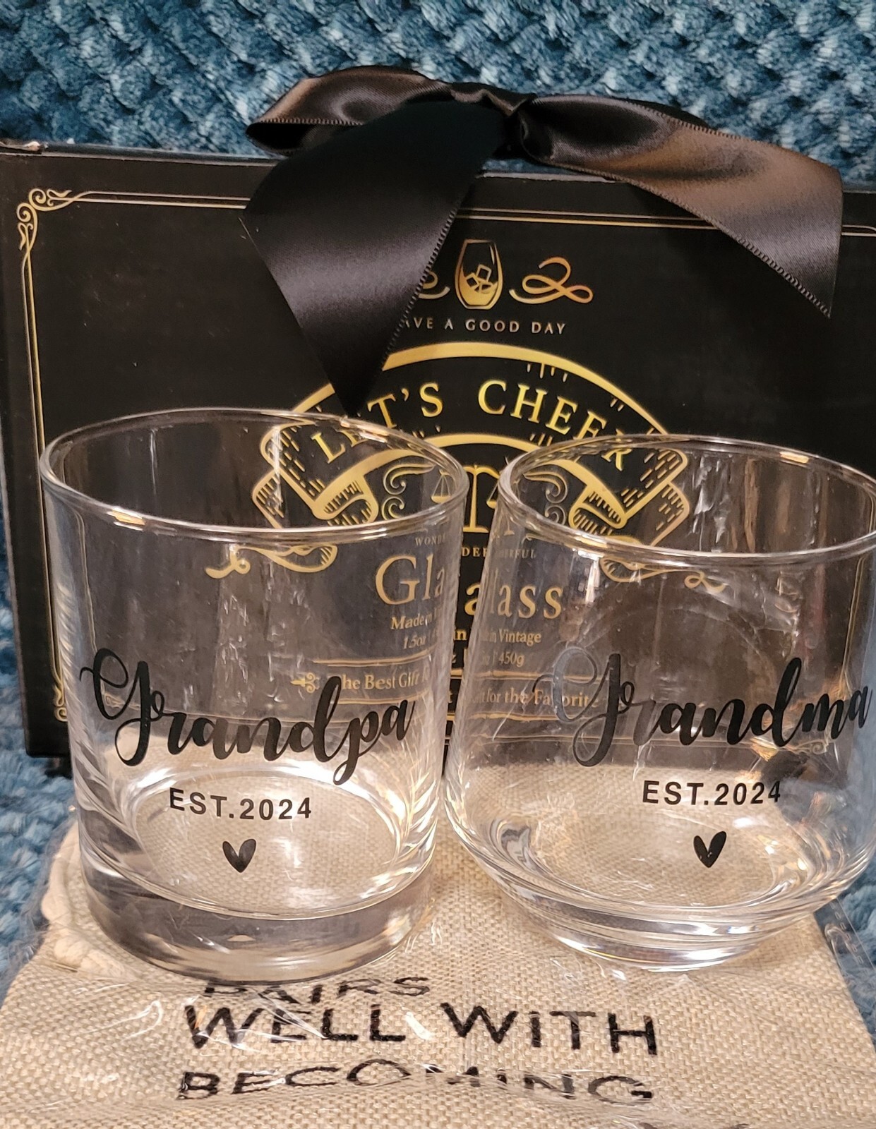 🌟 Celebrate New Beginnings with Our Est 2024 Grandparents Wine Glass Set! 🌟 Introducing the perfect gift for first-time grandparents! Our delightful 15oz wine glass set is an ideal way to toast new milestones and create unforgettable memories. Housed in a beautifully crafted wine bag, this set is not just a gift; it's a heartfelt celebration perfect for birthdays, baptisms, and special occasions! 🍷 Key Features: Thoughtful Design: Each stemless wine glass features a narrow opening and a wide bottom, preventing overflow and enhancing stability. The smooth edge design and thick base ensure that it’s easy to hold and enjoy every sip. Lead-Free Crystal Glass: Crafted from high-quality, lead-free crystal glass, these glasses are durable and safe for everyday use. The thick base and scratch-resistant surface make them perfect for daily enjoyment or special occasions. Dishwasher Safe: Enjoy the convenience of a long-lasting gift without the hassle! Our wine glasses are dishwasher safe, featuring a print that never fades. They’re as easy to clean as they are to enjoy! Versatile Gift for All Beverages: Perfect for all types of beverages! This stylish set is suitable for any occasion, whether you’re hosting a fancy dinner party or enjoying a cozy night in. Complete Gift Set: This product includes a two glass set packaged in an elegant ‘Est 2024’ wine bag, making it a thoughtful and ready-to-gift choice for grandparent celebrations. 🎉 Why Choose Our Wine Glass Set? This unique glass set is not only a practical addition to any kitchen but also a beautiful keepsake for new grandparents. Make their hearts smile with every sip as they embrace their new role! 📦 What’s Included: 1 Stemless Wine Glass 1 Whiskey Glass 1 x 'Est 2024' Wine Bag 💌 Order Yours Today! Don’t miss out on this perfect gift to celebrate new grandparents. Click "Buy Now" and help them raise a toast to love, family, and new beginnings! 🥂✨