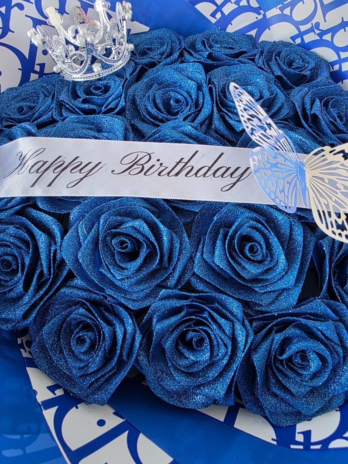 The Eternal Glitter Rose Bouquet in blue is a stunning artificial bouquet featuring 25 silk roses in a beautiful blue colour. This floral-themed arrangement is perfect for adding a touch of elegance to any home décor scheme. The intricate detailing of the roses, combined with the shimmering glitter accents, creates a captivating display that will never wilt or fade. Ideal for those who appreciate the timeless beauty of roses without the maintenance requirements of fresh blooms. including 1 small Crown 1 birthday banner 1 Butterfly