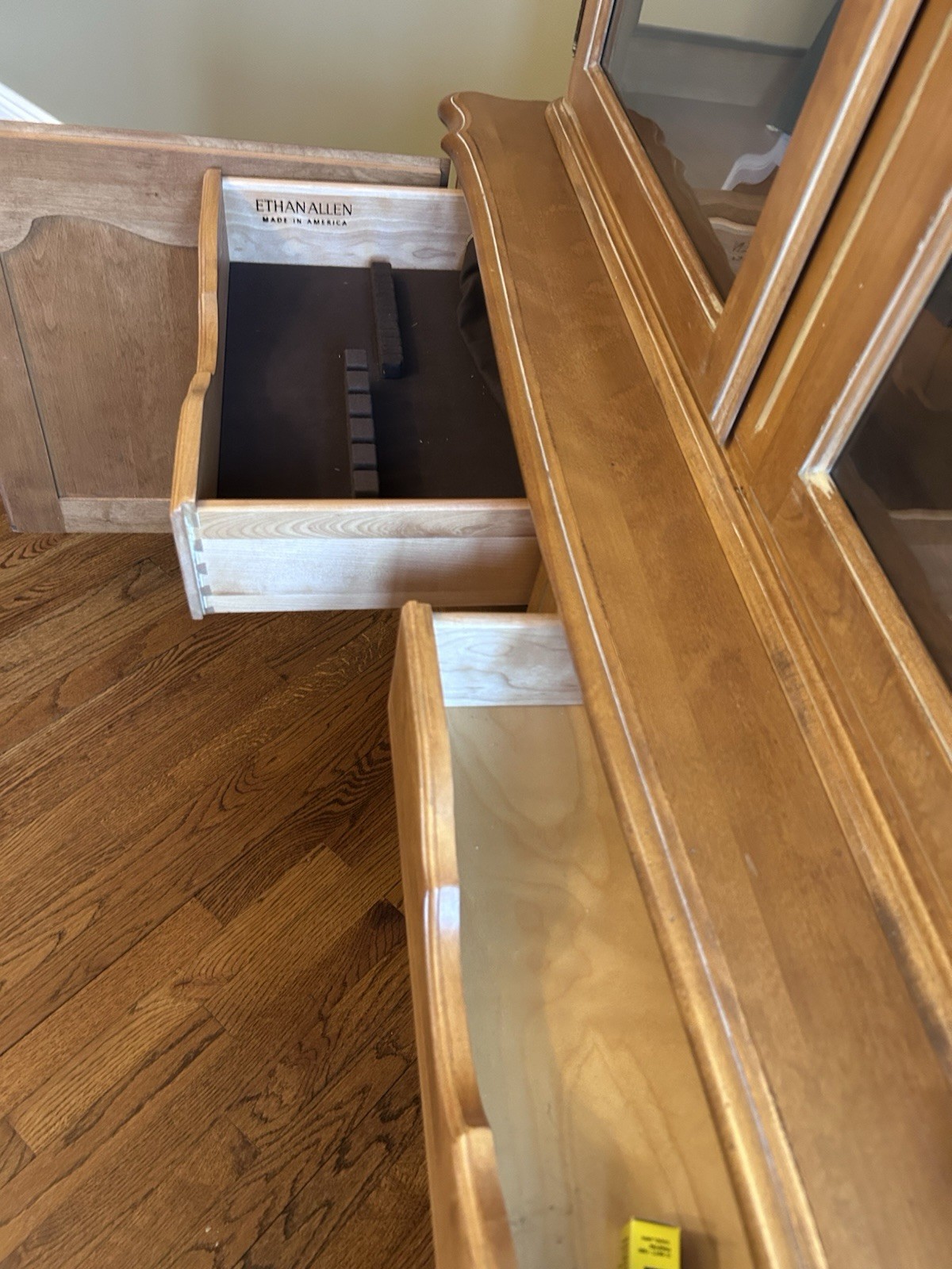 Ethan Allen Legacy Cabinet is a beautiful and functional piece of furniture. The top piece has ornate glass doors, slightly wave glass for added character. Adjustable shelves, mirrored back wall and on/off lighting. The bottom piece has shelves and 2 drawers with removable velvet trays for storage and organizing utensils. This well-crafted solid maple wood cabinet is in excellent condition. Its 2 separate pcs that secure on top of each other. 80 inches high, 60 inches wide and 22 inches deep. **PLEASE NOTE Pick up only NY**