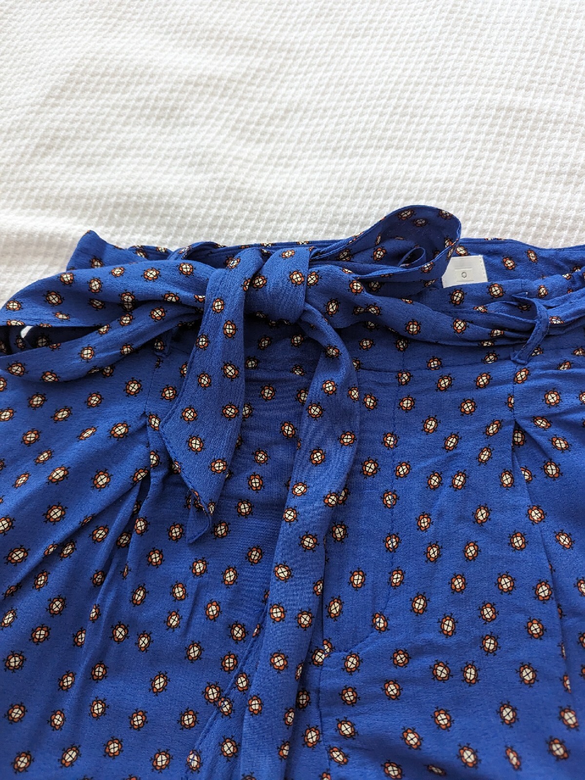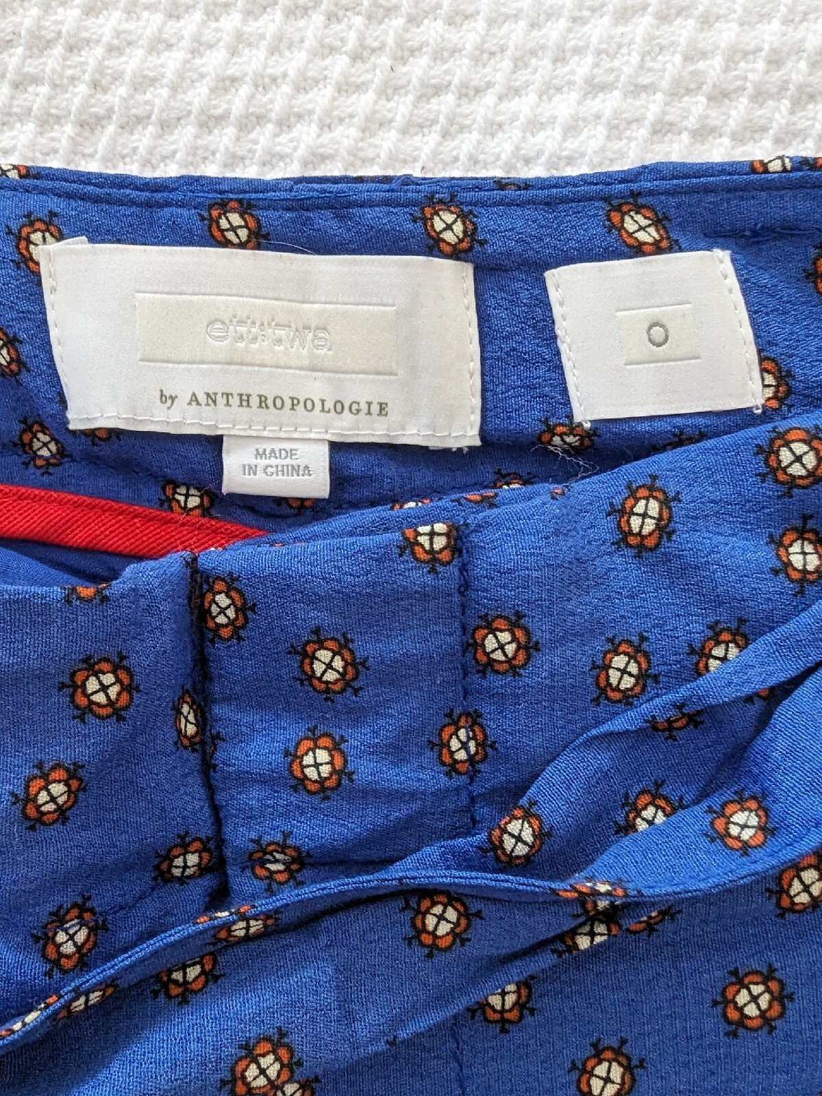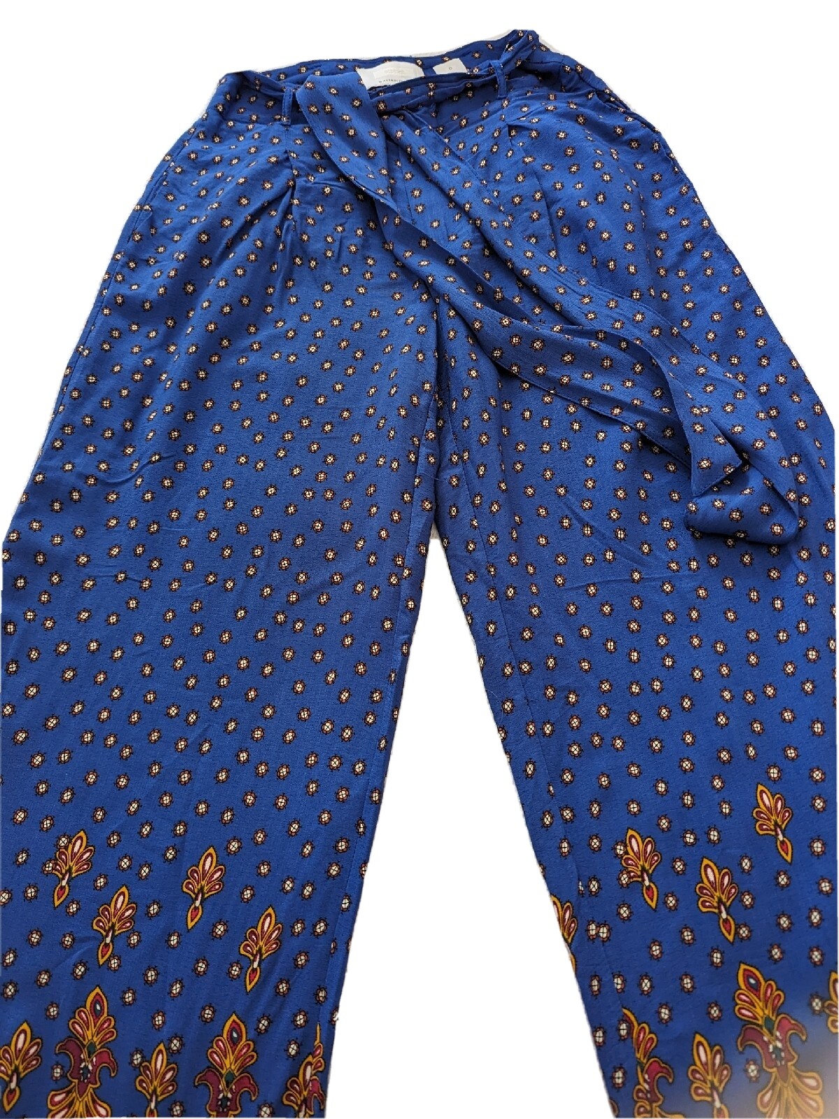 Elevate your wardrobe with these stunning Anthropologie palazzo pants in a beautiful blue and gold paisley floral pattern. Perfect for both casual and formal occasions, these relaxed fit pants have a flat front and a high rise waist. Waist measures 28" inches. Length is ,30", hip 18" glat.The lightweight, breathable crepe fabric makes them ideal for summer, fall, or spring. These pants come with a tie accent, belted waist, and pockets for added convenience. Made of viscose material, they require hand wash only. These wide-leg pants are available in a regular size and are suitable for women who love to flaunt their style. Add a touch of India to your outfit with these stylish pants.
