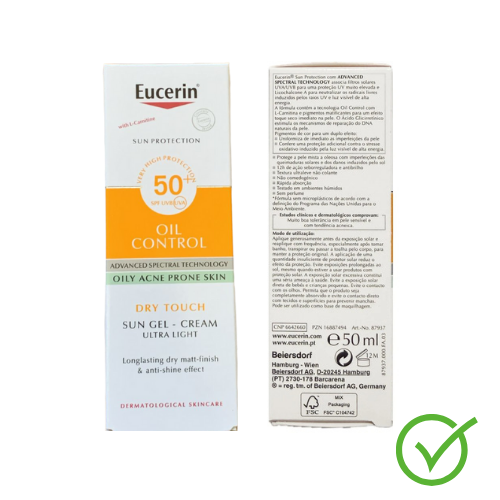 🌞 Eucerin Sun Protection Oil Control Gel-Cream Tinted Light SPF50+ – 50ml Description: Achieve advanced sun protection and a flawless matte finish with Eucerin Sun Protection Oil Control Gel-Cream Tinted Light SPF50+ . This dermatologically tested formula provides very high UVA/UVB protection while helping to control excess oil and shine , making it perfect for oily and acne-prone skin . ✨ Key Features & Benefits Very High SPF50+ Protection: Shields skin from harmful UVA/UVB rays and prevents sun-induced damage. Anti-Shine Formula: Enriched with L-Carnitine and micro-particles to absorb excess oil and leave an instant dry-touch, matte finish. Powerful Antioxidant Defense: Contains Licochalcone A to neutralize free radicals caused by UV and HEVIS (High Energy Visible Light). Cellular Support: Glycyrrhetinic acid helps strengthen natural skin defense and supports DNA repair mechanisms. Tinted Formula: Provides light, natural coverage for an even skin tone — ideal as a daily base or under makeup. Non-Comedogenic & Fragrance-Free: Gentle on sensitive and acne-prone skin. Water & Sweat Resistant: Long-lasting protection, even in humid conditions. 💧 Texture & Application Lightweight gel-cream texture that absorbs quickly without leaving a greasy or sticky residue. Suitable for everyday use, including under makeup. Safe for the sensitive eye contour area. ✅ Dermatologically Tested Excellent skin tolerance for sensitive, oily, and acne-prone skin. Tested in humid climates to ensure lasting comfort and performance.