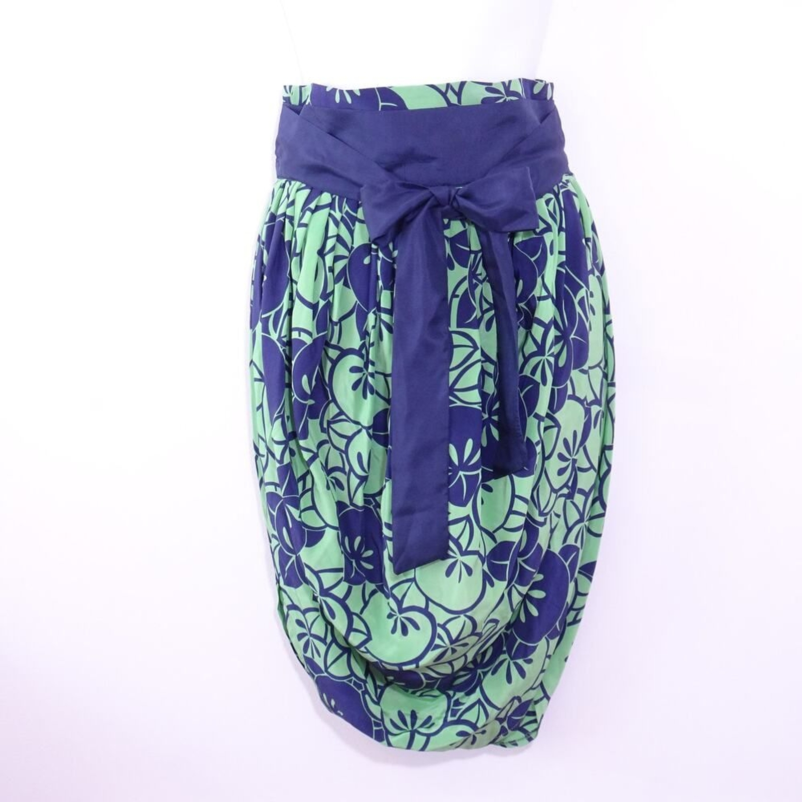 Eva Franco Harem Bubble Skirt In Green and Navy Palm Here's the scoop Silk Pleated high waist Navy blue Banded stitched and tie waist green and navy print Invisible Side Zipper Navy Blue Lining Draped and pleated So cute The ease of shorts with the feminine appeal of a streamlined Eva Franco Skirt This Bubble Drape Skirt elevates the classic skirt with its premium rich silk, Sash stitched high waist.. flattering high waistline and abbreviated A-line silhouette. The lining sallow for full coverage and freedom of movement. Pair with a simple tee for everyday chic or wear with the coordinating Glam for a spring-suiting moment no one will forget.