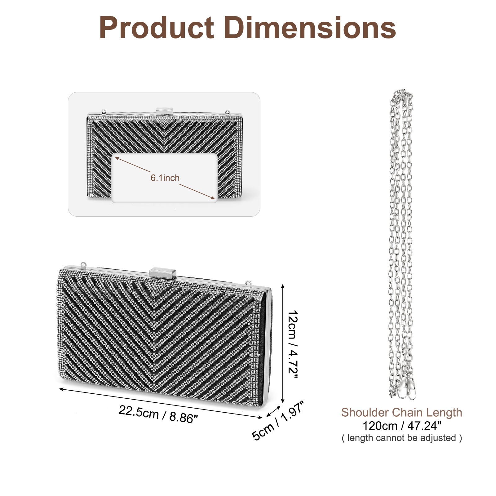 Document Description:Capable: The evening bag is enough to hold the most needed items, such as makeup brushes, mobile phones, cards, money, car keys, and small wallets, ensuring you are prepared for any occasion.[Fashion Style Design]: Our luxury and sparkly evening clutch is full of dazzling rhinestones, with a gold metal frame and a snap button design on the top, exudes a charming and elegant atmosphere. Evening bags have a timeless appeal, which will match your clothing perfectly and make you charming. This evening clutch with sparkling rhinestones will make you glow during your special occasion.[Metal Frame Design]: The clutch bag adopts metal frame, hook closure design, which increases the security of internal items, and the soft and smooth satin lining provides better protection.[Multiple Ways to Wear It]: The detachable shoulder strap of this purse can be turned into a shoulder bag, crossbody bag or handbag, making this evening bag more versatile and suitable for any formal occasion.[Perfect for Special Occasions]: This clutch bag is perfect for parties, banquets, weddings, parties and any other formal occasions, making you look elegant and sophisticated. This women's evening handbag is the perfect choice to show your elegance, sophistication and fashion sense. Feature:Size(LxWxH): 22.5 x 5 x 12 cm / 8.86 x 1.97 x 4.72 inchesHandbag weight: 0.84 poundMaterial: PU leather and crystal rhinestoneColor: BlackShoulder strap length: 120 cm / 47.24 inchPackage included: 1 Pcs Evening Handbags; Evening Bags Clutch Purses for Women, Rhinestones Crossbody Handbags Black Description: Capable: The evening bag is enough to hold the most needed items, such as makeup brushes, mobile phones, cards, money, car keys, and small wallets, ensuring you are prepared for any occasion. [Fashion Style Design]: Our luxury and sparkly evening clutch is full of dazzling rhinestones, with a gold metal frame and a snap button design on the top, exudes a charming and elegant atmosphere. Evening bags have a timeless appeal, which will match your clothing perfectly and make you charming. This evening clutch with sparkling rhinestones will make you glow during your special occasion. [Metal Frame Design]: The clutch bag adopts metal frame, hook closure design, which increases the security of internal items, and the soft and smooth satin lining provides better protection. [Multiple Ways to Wear It]: The detachable shoulder strap of this purse can be turned into a shoulder bag, crossbody bag or handbag, making this evening bag more versatile and suitable for any formal occasion. [Perfect for Special Occasions]: This clutch bag is perfect for parties, banquets, weddings, parties and any other formal occasions, making you look elegant and sophisticated. This women's evening handbag is the perfect choice to show your elegance, sophistication and fashion sense. Feature: Size(LxWxH): 22.5 x 5 x 12 cm / 8.86 x 1.97 x 4.72 inches Handbag weight: 0.84 pound Material: PU leather and crystal rhinestone Color: Black Shoulder strap length: 120 cm / 47.24 inch Package included: 1 Pcs Evening Handbags; Hot Item Payment 1.We accept eBay payment . 2.Payment must be received within 7 business days of auction closing. Shipping 1.We ship to your eBay or Paypal address. Please make sure your eBay and Paypal address is correct before you pay. 2.Items will be shipped within 1-3 business day when we received payment. 3.Delivery time depends on destination and other factors. Description Policy Evening Bags Clutch Purses for Women, Rhinestones Crossbody Handbags Black Description: Capable: The evening bag is enough to hold the most needed items, such as makeup brushes, mobile phones, cards, money, car keys, and small wallets, ensuring you are prepared for any occasion. [Fashion Style Design]: Our luxury and sparkly evening clutch is full of dazzling rhinestones, with a gold metal frame and a snap button design on the top, exudes a charming and elegant atmosphere. Evening bags have a timeless appeal, which will match your clothing perfectly and make you charming. This evening clutch with sparkling rhinestones will make you glow during your special occasion. [Metal Frame Design]: The clutch bag adopts metal frame, hook closure design, which increases the security of internal items, and the soft and smooth satin lining provides better protection. [Multiple Ways to Wear It]: The detachable shoulder strap of this purse can be turned into a shoulder bag, crossbody bag or handbag, making this evening bag more versatile and suitable for any formal occasion. [Perfect for Special Occasions]: This clutch bag is perfect for parties, banquets, weddings, parties and any other formal occasions, making you look elegant and sophisticated. This women's evening handbag is the perfect choice to show your elegance, sophistication and fashion sense. Feature: Size(LxWxH): 22.5 x 5 x 12 cm / 8.86 x 1.97 x 4.72 inches Handbag weight: 0.84 pound Material: PU leather and crystal rhinestone Color: Black Shoulder strap length: 120 cm / 47.24 inch Package included: 1 Pcs Evening Handbags; Hot Item Payment 1.We accept eBay payment . 2.Payment must be received within 7 business days of auction closing. Shipping 1.We ship to your eBay or Paypal address. Please make sure your eBay and Paypal address is correct before you pay. 2.Items will be shipped within 1-3 business day when we received payment. 3.Delivery time depends on destination and other factors.