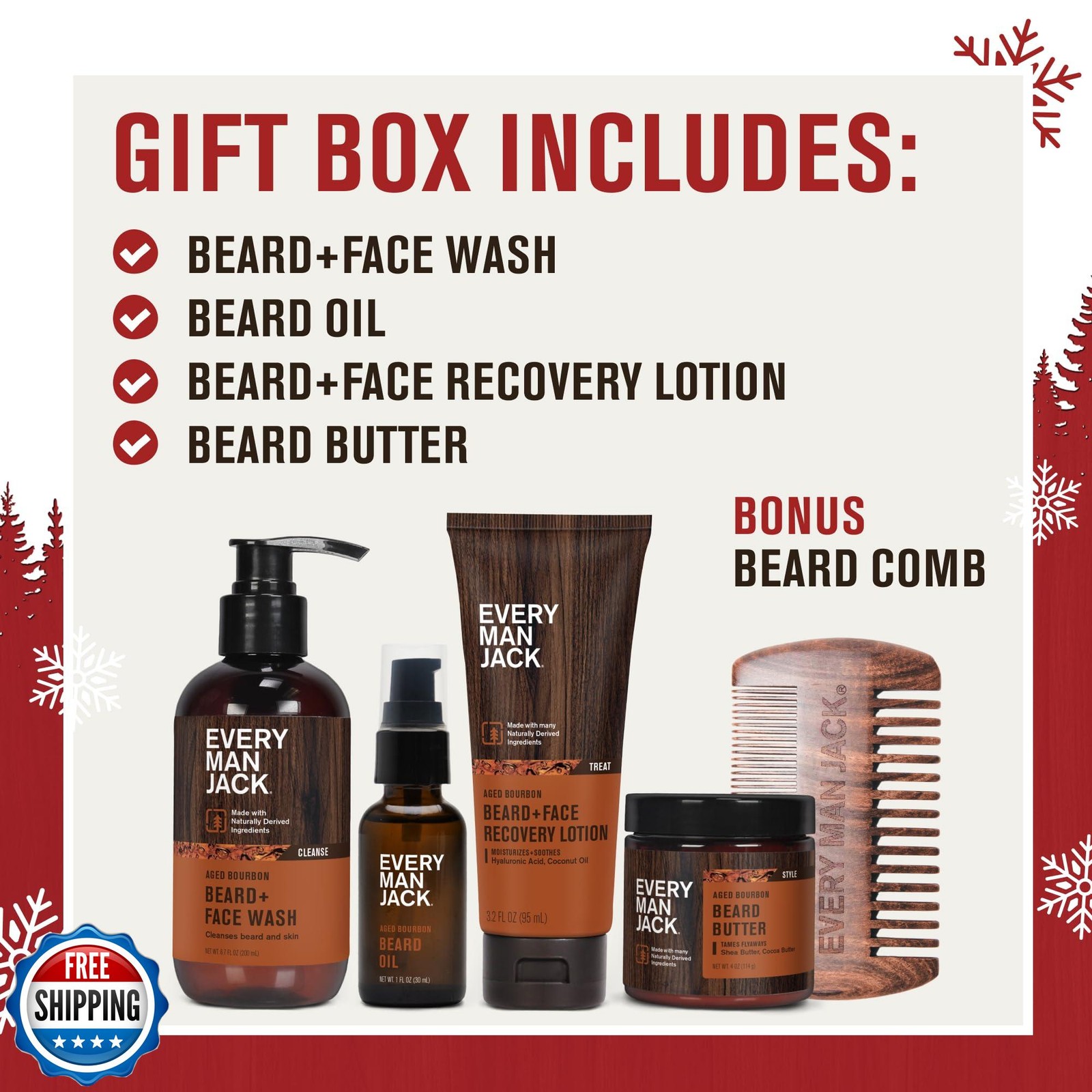 Every Man Jack Mens Aged Bourbon Beard Set - Five Full-Sized Grooming Essentials For a Complete Routine - Beard + Face Wash, Beard + Face Lotion, Hydrating Beard Oil, Beard Butter, and Beard Comb Features NATURALLY DERIVED INGREDIENTS: High quality, effective plant-based ingredients like Shea Butter, Aloe Vera, Coconut Oil, Glycerin, Hyaluronic Acid, and Witch Hazel. No Parabens. No Phthalates. No dyes. And never tested on animals. SMELL SWEET AND SPICY: Smell like your favorite tasting notes without the burn. Vanilla makes you smell sweet and smooth, with a perky hint of conifers. MADE FOR MEN LIKE YOU: Specially formulated to cleanse, hydrate, and soften facial hair; Beard + Face Wash cleanses away oil and build-up around your beard and the skin underneath; Beard Oil conditions and softens; Beard Butter hydrates, relieving itchiness and dryness, and tames flyaways; Recovery Beard + Face Lotion moisturizes and helps reduce itch, flakes, and skin irritation A COMPLETE REGIMEN: Everything you need for a complete beard care routine; step 1: cleanse with Beard Wash; step 2: treat with Recovery Beard + Face Lotion; step 3: hydrate with Beard Butter and Beard Oil RESPONSIBLY MADE IN THE USA: Born at the base of Mt. Tamalpais in Marin County, CA, sustainably minded packaging, manufactured in the USA; No Parabens. No Phthalates. No dyes. And never tested on animals. Shipping Free & Fast Shipping: We offer free shipping to most of the USA with a normal delivery time of 3-7 days. However, due to the current situation, additional delivery time (up to 3 weeks) may be required for some items. Alternative Carriers: We may use alternative carriers (e.g., USPS, FedEx, UPS) to ensure your package arrives safely and on time. Due to the use of multiple carriers, we are unable to provide a tracking number automatically. Handling Time: Orders are processed and shipped within 1-2 business days of receiving cleared payment. Shipping Restrictions: Shipping to Alaska, Hawaii, Puerto Rico, Guam, and other US territories may incur shipping charges or delivery restrictions. Please contact us before ordering, or your order can be refunded/cancelled. State Restrictions: Certain items may not be shipped to California due to state regulations. Contact for Tracking Updates: If you require tracking updates or have any concerns about the delivery of your order, please feel free to contact us, and we will be happy to assist you. Return Policy 30-Day Hassle-Free Returns: If you are not completely satisfied with your purchase, you can return the item for free within 30 days of receiving it for a full refund or exchange. Easy Return Process: Contact us, and we will provide you with a prepaid return shipping label and detailed instructions. No Restocking Fee: There are no restocking fees for returns. However, the buyer is responsible for return shipping costs if the return is not due to a seller"s error. Refund Processing: Refunds will be processed within 1 business day of receiving the returned item in its original condition. Feedback Your feedback is extremely important to us. We strive to provide the best products and customer service possible. If you are satisfied with your purchase, please take a moment to leave us a positive review. If you have any concerns or issues with your order, please contact us before leaving negative feedback. We are committed to resolving any problems and ensuring your satisfaction. Contact Us If you have any questions or concerns, please feel free to reach out to our customer support team. You can contact us through the eBay messaging system. We are available Monday to Friday, 9:00 am to 5:00 pm EST, and we will do our best to respond to your inquiry within 24 hours. Thank you for supporting our small family business!